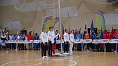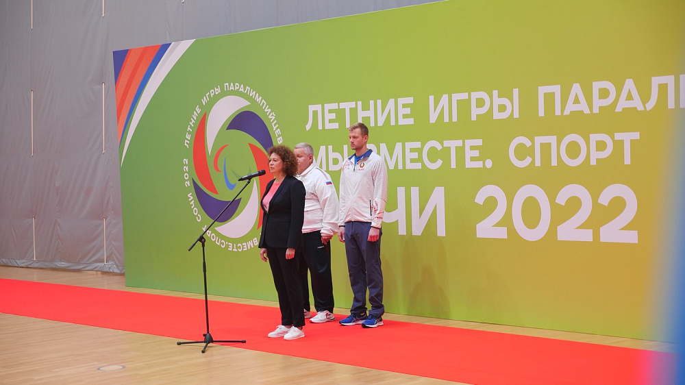 Затем флаг страны-хозяйки был торжественно поднят под национальный гимн, который прозвучал в исполнении бронзового призёра Паралимпийских игр в Токио по фехтованию Людмилы Васильевой.