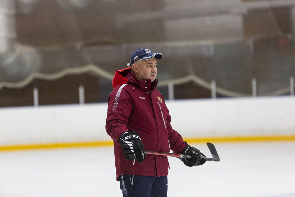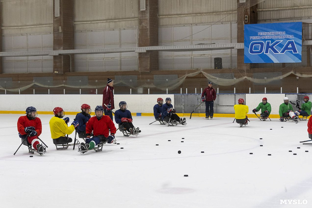 Старший тренер команды Руслан Батыршин объясняет команде установку на тренировку. Среди участников сбора — серебряные призеры Паралимпийских игр по следж-хоккею: Дмитрий Лисов, Илья Волков, Василий Варлаков, Иван Кузнецов, Евгений Петров, Николай Терентьев, а также призеры чемпионатов мира и чемпионы Европы.