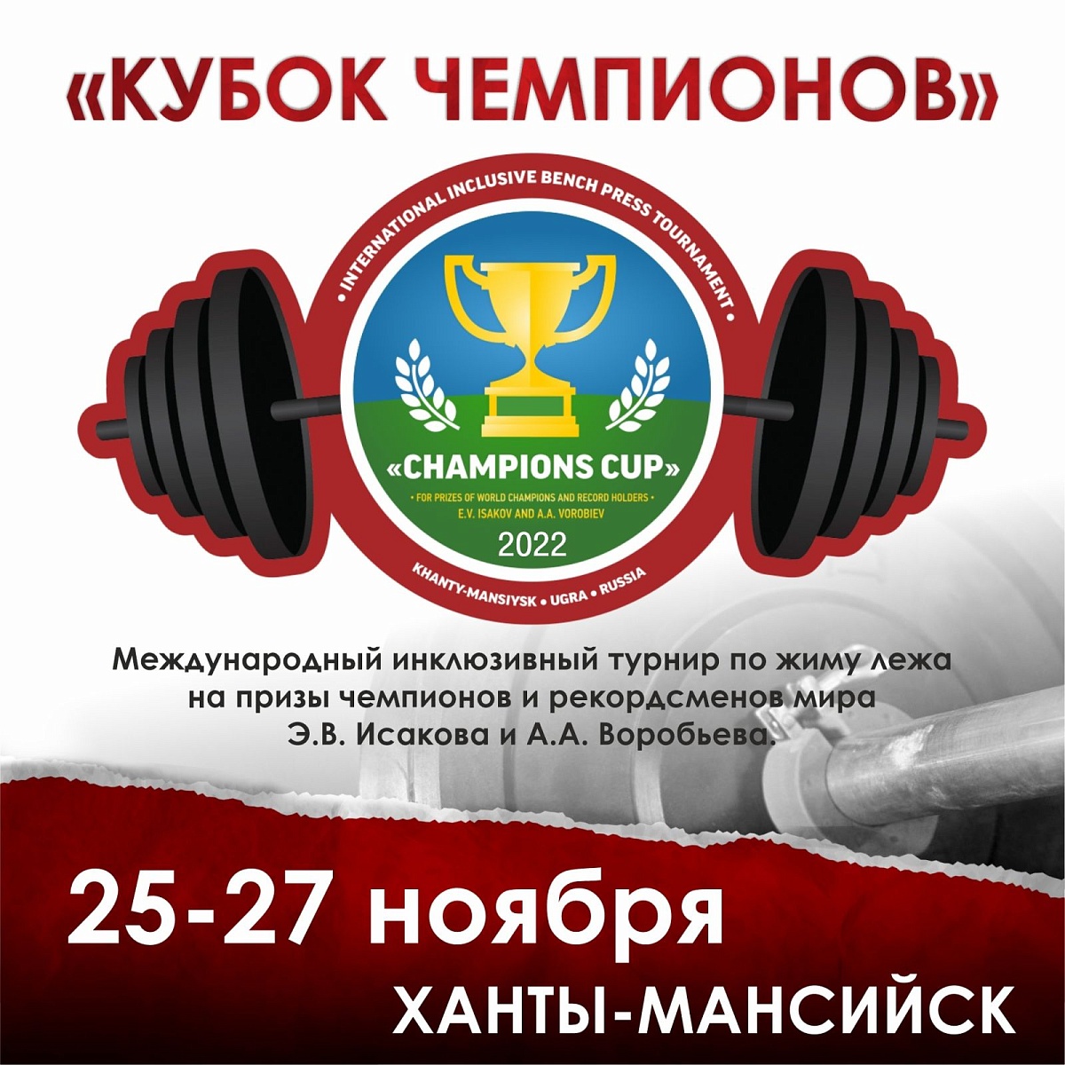 С 25 по 27 ноября в Ханты-Мансийске (ХМАЮ-Югра) пройдет восьмой по счету инклюзивный турнир по пауэрлифтингу «Кубок чемпионов» на призы чемпионов и рекордсменов мира Эдуарда Исакова и Алексея Воробьева.