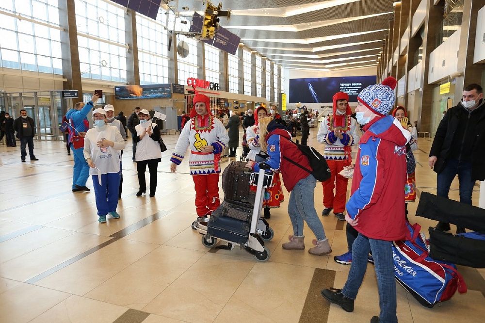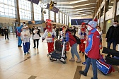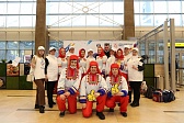 В аэропорту спортсменов и тренеров встречают артисты и символ Спартакиады - пингвин Лаки.