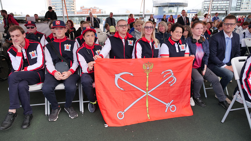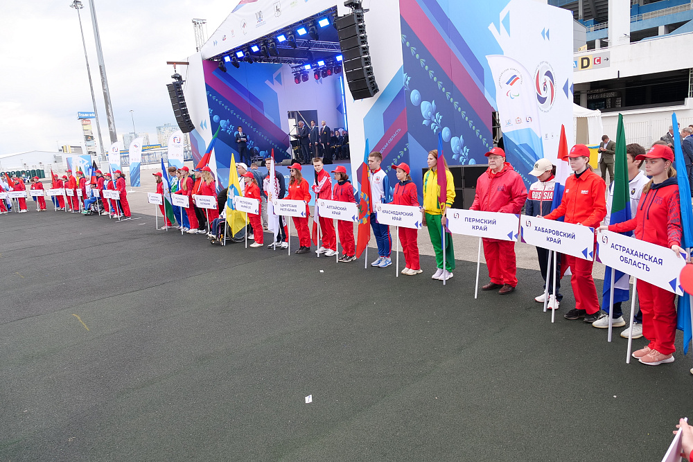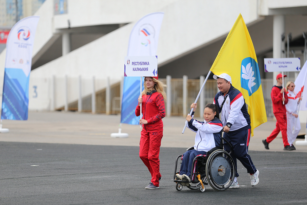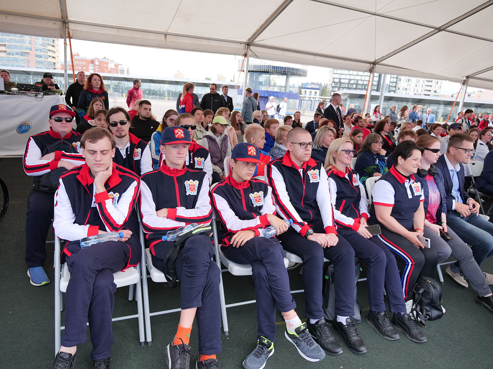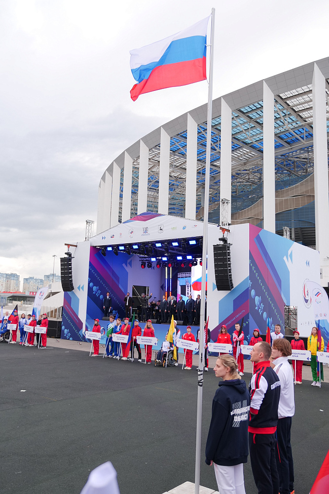 Далее состоялась торжественная церемония выноса Государственного флага Российской Федерации. Почетную миссию выполнили 6-кратный чемпион Паралимпийских игр по плаванию спорта лиц с ПОДА Андрей Калина,3-кратная чемпионка Паралимпийских игр по плаванию спорта ЛИН Валерия Шабалина, 2-кратный бронзовый призер Паралимпийских игр по дзюдо спорта слепых Алеся Степанюк и чемпион Паралимпийских игр по плаванию спорта слепых Владимир Сотников.