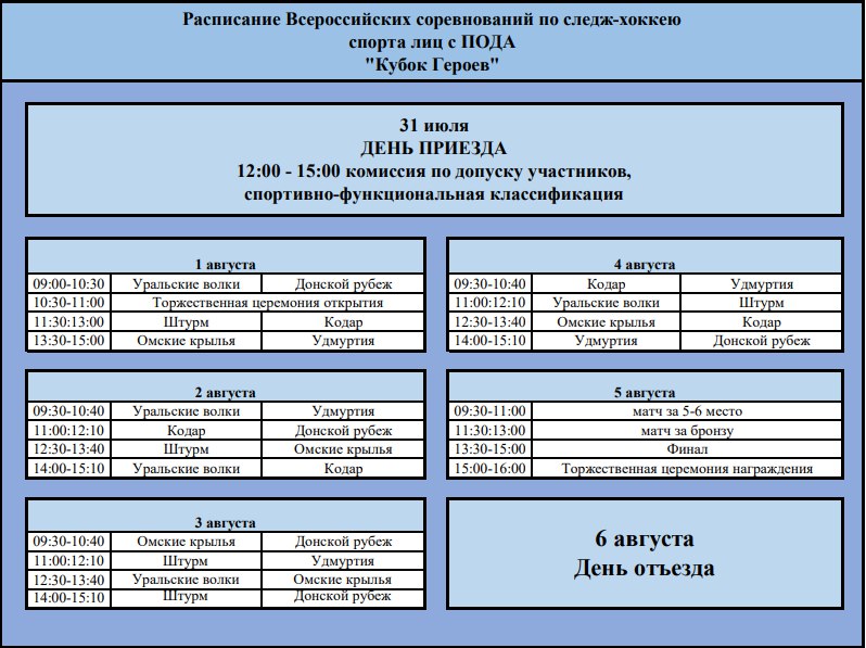 С 31 июля по 06 августа 2025 года в г. Туле (Тульская область) на ледовой арене «Тропик» (ул. Демьянова 26Б) пройдут Всероссийские соревнования по хоккею-следж «Кубок героев»