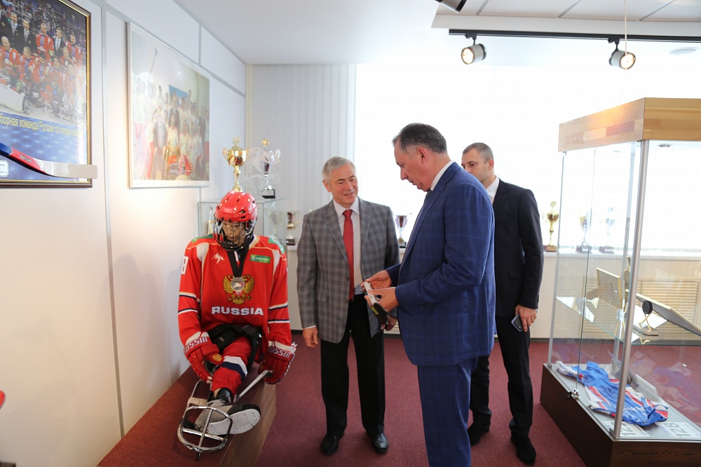 В преддверии встречи Станислав Поздняков в сопровождении Павла Рожкова ознакомился с экспозицией музея паралимпийского спорта и сделал памятную запись в книге гостей музея.