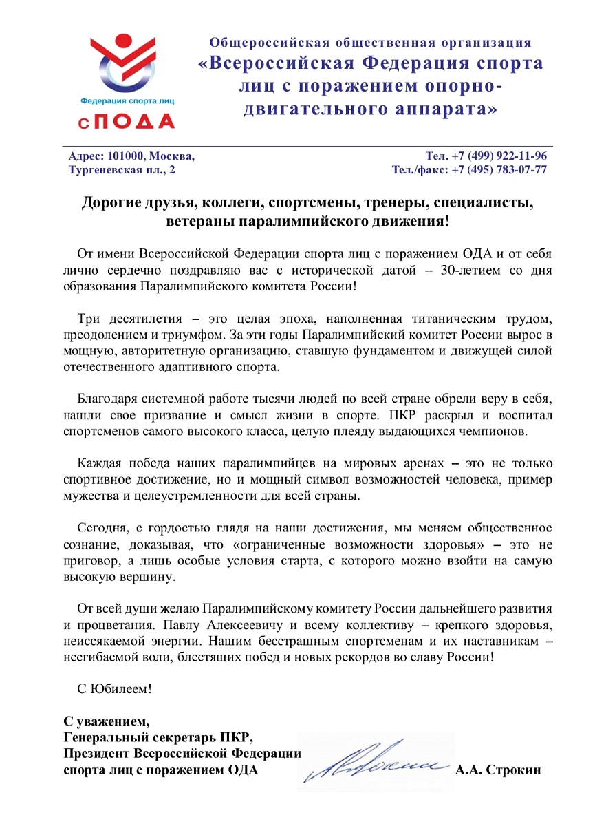 Поздравление Президента Всероссийской Федерации спорта лиц с ПОДА Андрея Александровича Строкина Паралимпийскому комитету России с 30-летием со дня основания