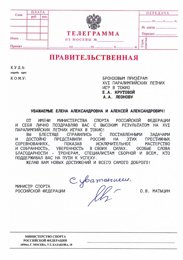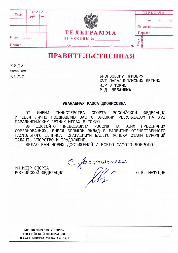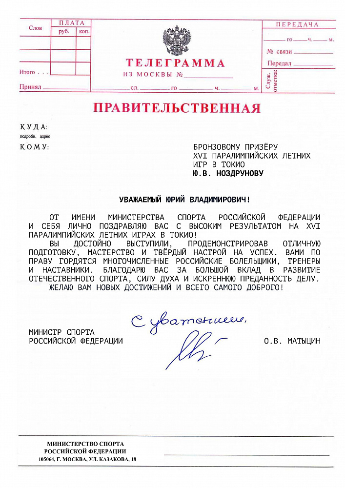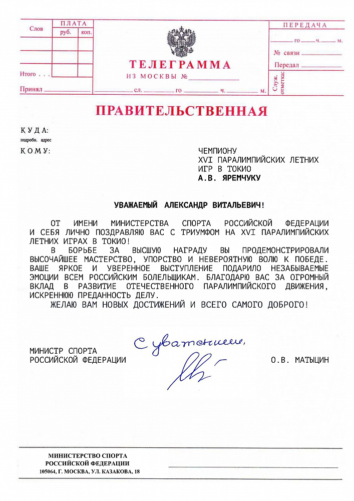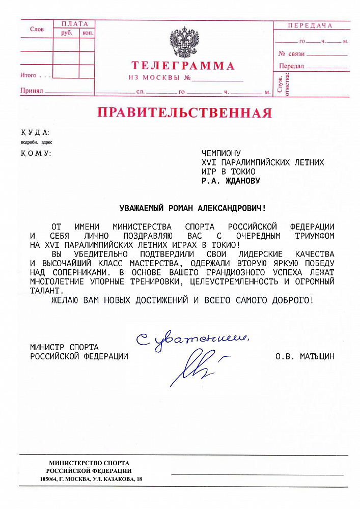 О.В. Матыцин направил поздравления спортсменам команды ПКР – победителям и призерам XVI Паралимпийских летних игр в г. Токио