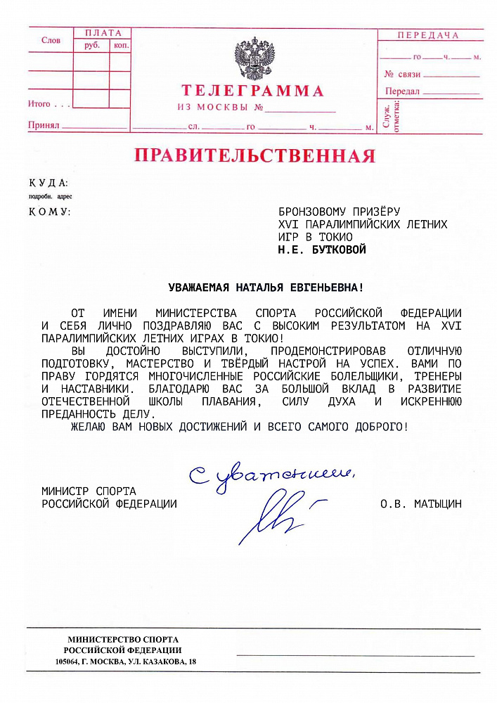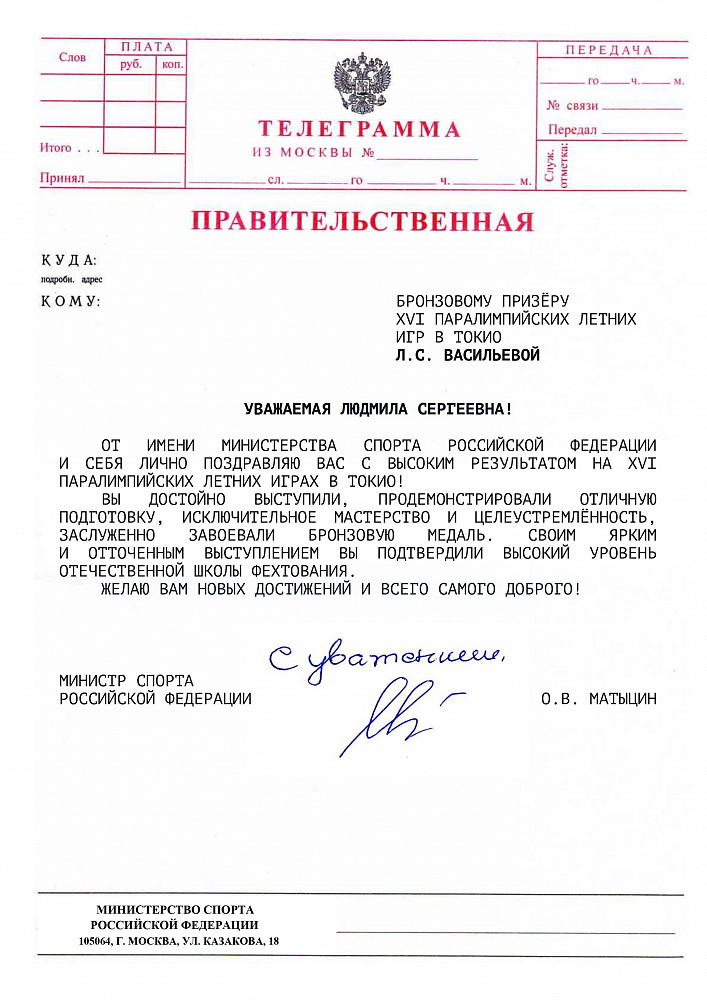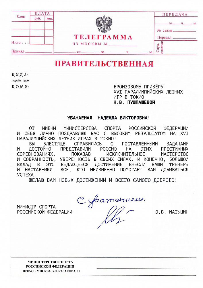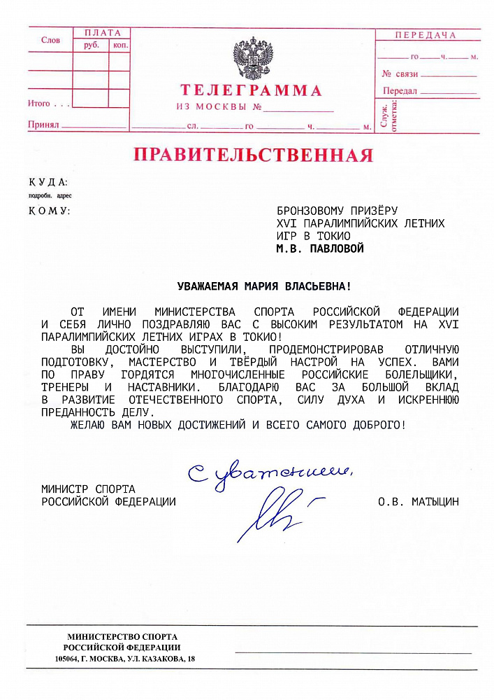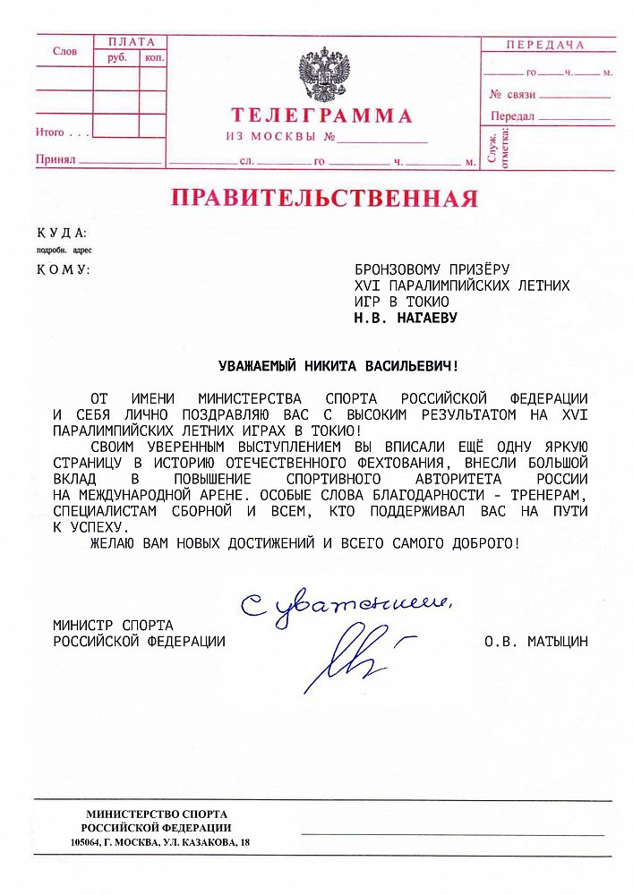 О.В. Матыцин направил поздравления спортсменам команды ПКР – победителям и призерам XVI Паралимпийских летних игр в г. Токио