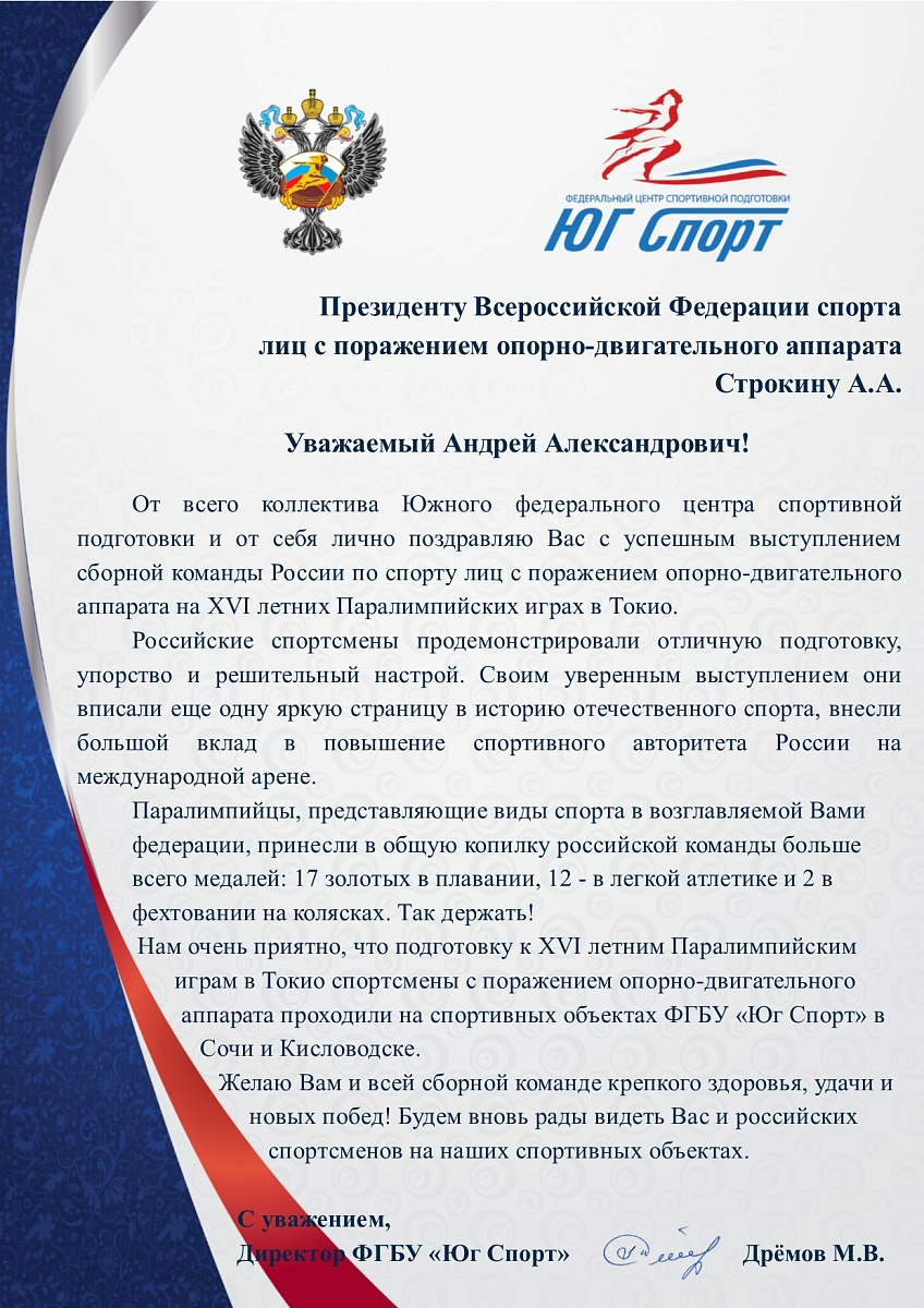 Директор Южного федерального центра спортивной подготовки «Юг-Спорт» М.В.Дрёмов поздравил Всероссийскую федерацию спорта лиц с поражением ОДА с успешным выступлением сборной команды России по спорту лиц с поражением ОДА на XVI Паралимпийских играх в Токио
