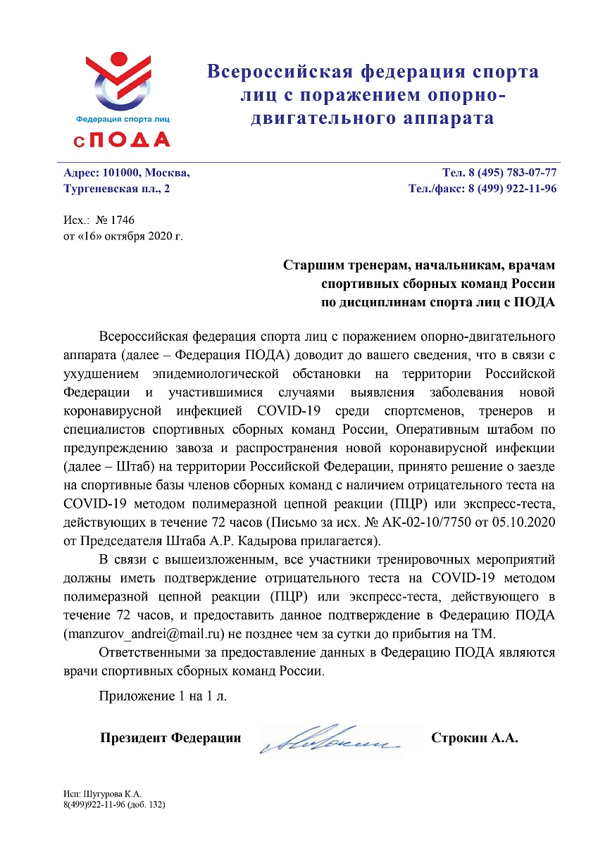 Информируем старших тренеров, начальников, врачей спортивных сборных команд России по дисциплинам спорта лиц с ПОДА о необходимости соблюдать требования при направлении членов сборных команд на тренировочные мероприятия