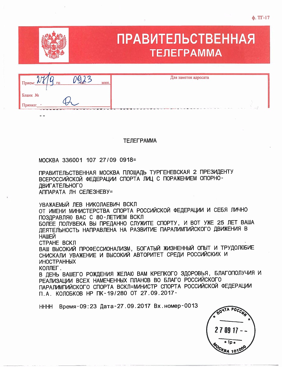 Министр спорта Российской Федерации, чемпион Олимпийских игр Павел Колобков направил поздравительную телеграмму президенту Всероссийской федерации спорта лиц с ПОДА Льву Селезневу в связи с 80-летним Юбилеем