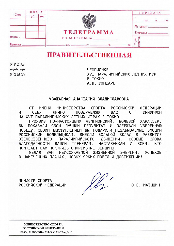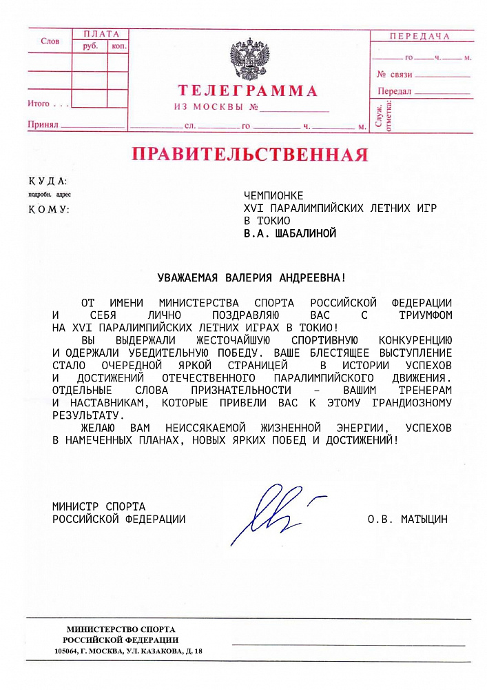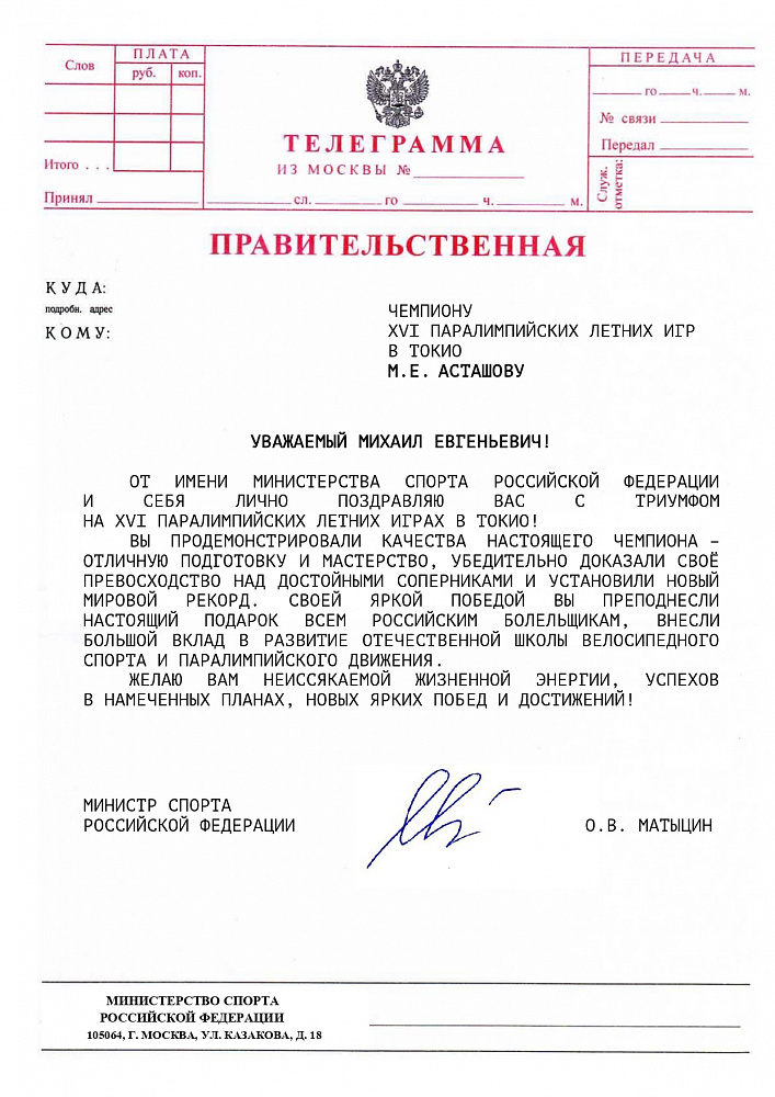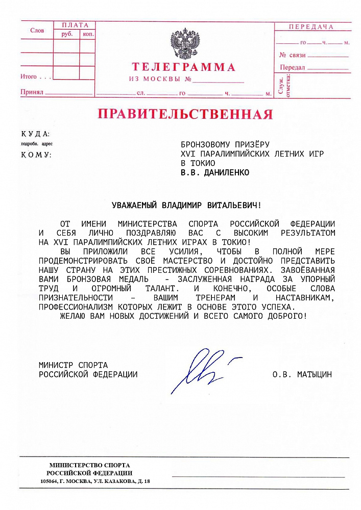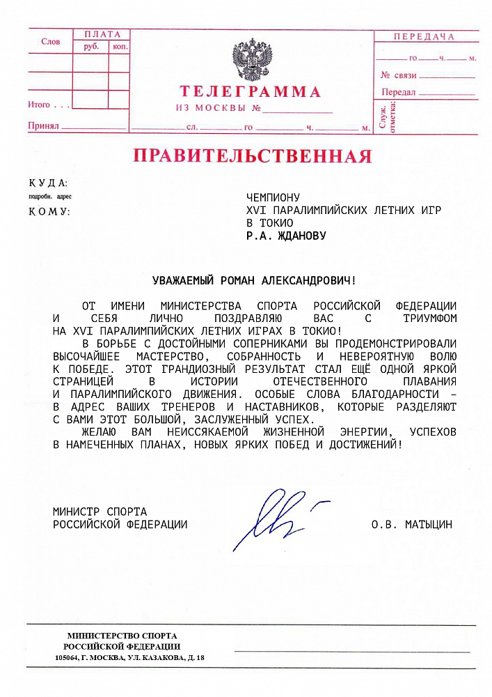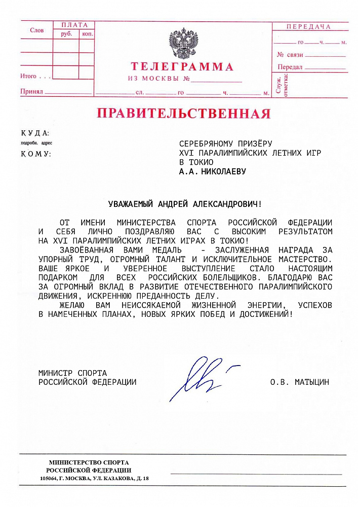 О.В. Матыцин направил поздравления спортсменам команды ПКР – победителям и призерам XVI Паралимпийских летних игр в г. Токио