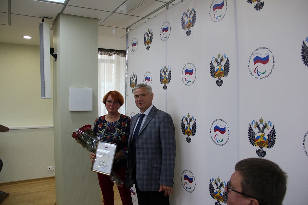 Участники заседания поздравили старшего тренера сборной команды России по теннису на колясках Ольгу Мурину с Юбилеем, после чего Павел Рожков вручил ей ведомственную награду ПКР – Благодарность «За большой вклад в развитие Паралимпийского движения в России».