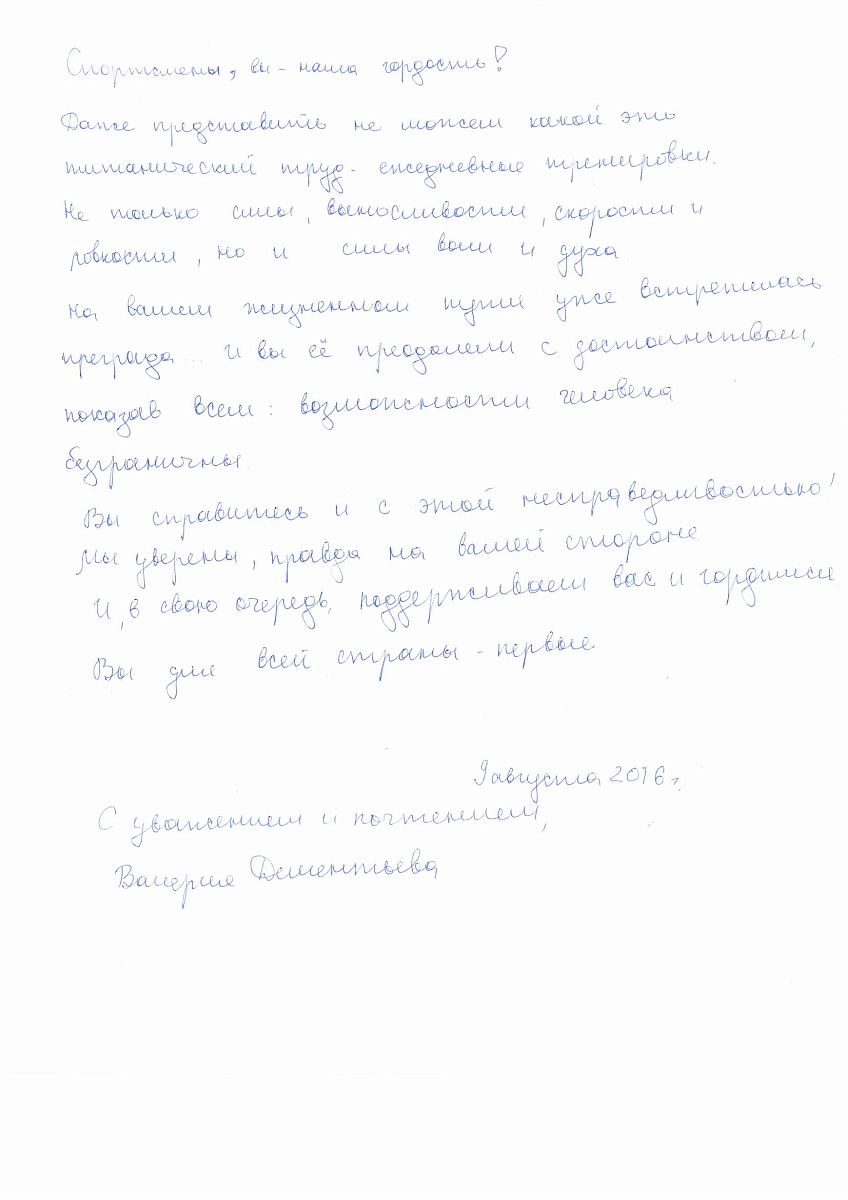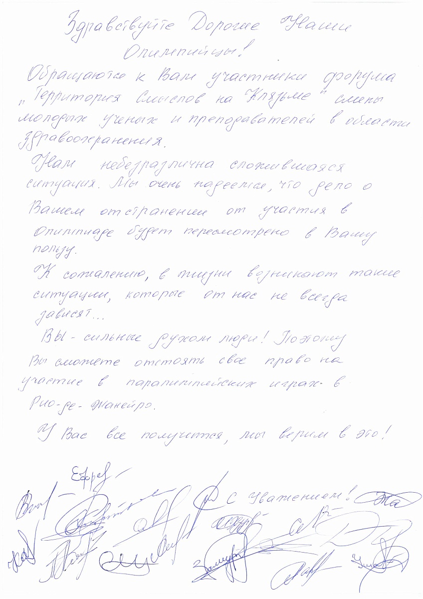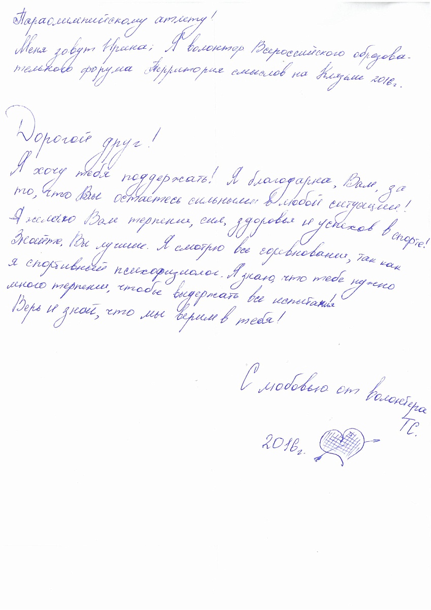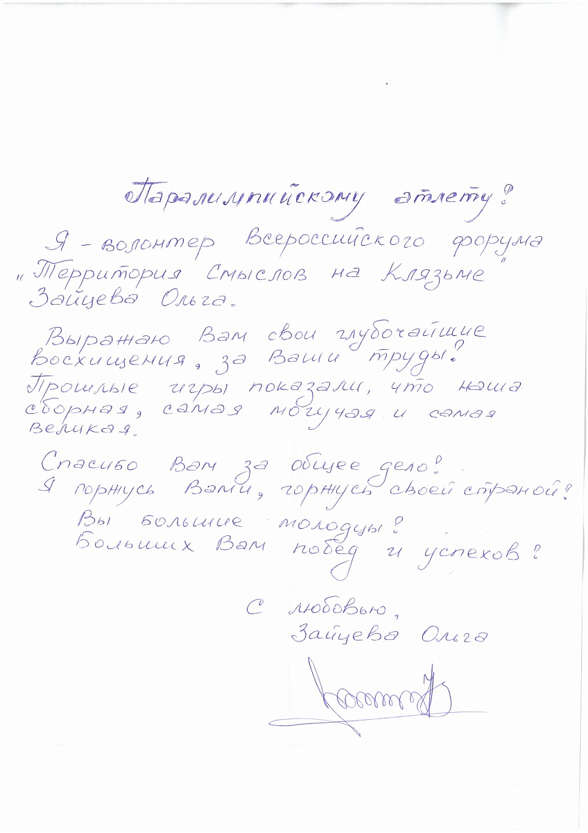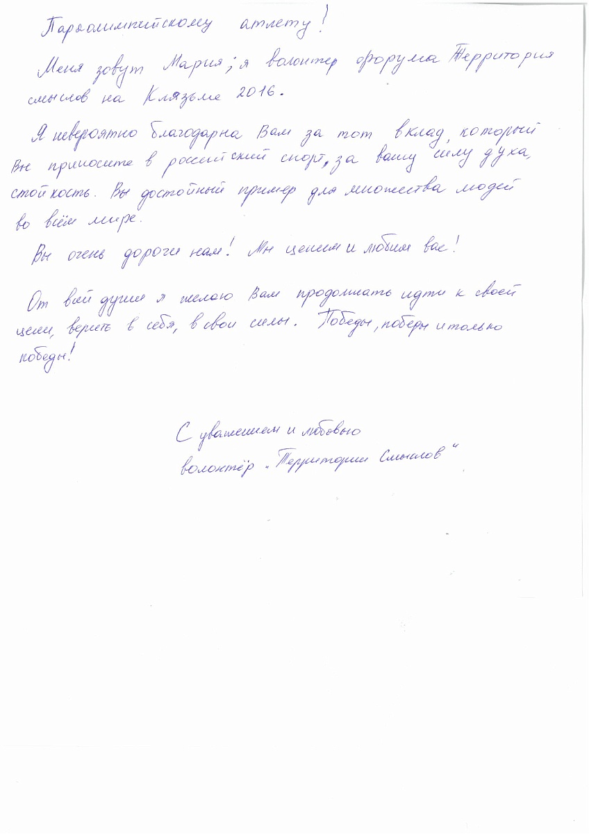 Паралимпийский комитет России получил письма в поддержку паралимпийской сборной команды России от участников Всероссийского молодежного образовательного форума «Территория смыслов» на Клязьме 9 августа участники федеральных молодёжных форумов по всей стране запустили масштабную кампанию в поддержку паралимпийской сборной России, которую в полном составе отстранили от участия в XV Летних Паралимпийских Игр в Рио-де-Жанейро. С инициативой написать письмо в Международный паралимпийский комитет выступил участник Всероссийского молодёжного образовательного форума «Территория смыслов». «Мы искренне восхищаемся силой духа и тела российских атлетов. Мы хотим напомнить им о том, как сильно мы гордимся ими и как сильно мы их уважаем. Мы хотим обратить ваше внимание на уровень поддержки. И мы просим вас не запрещать им участвовать в соревнованиях. Эти благородные атлеты тренировались в течение всей жизни, чтобы быть там и показать, что они способны творить невозможное», – говорится в тексте письма.