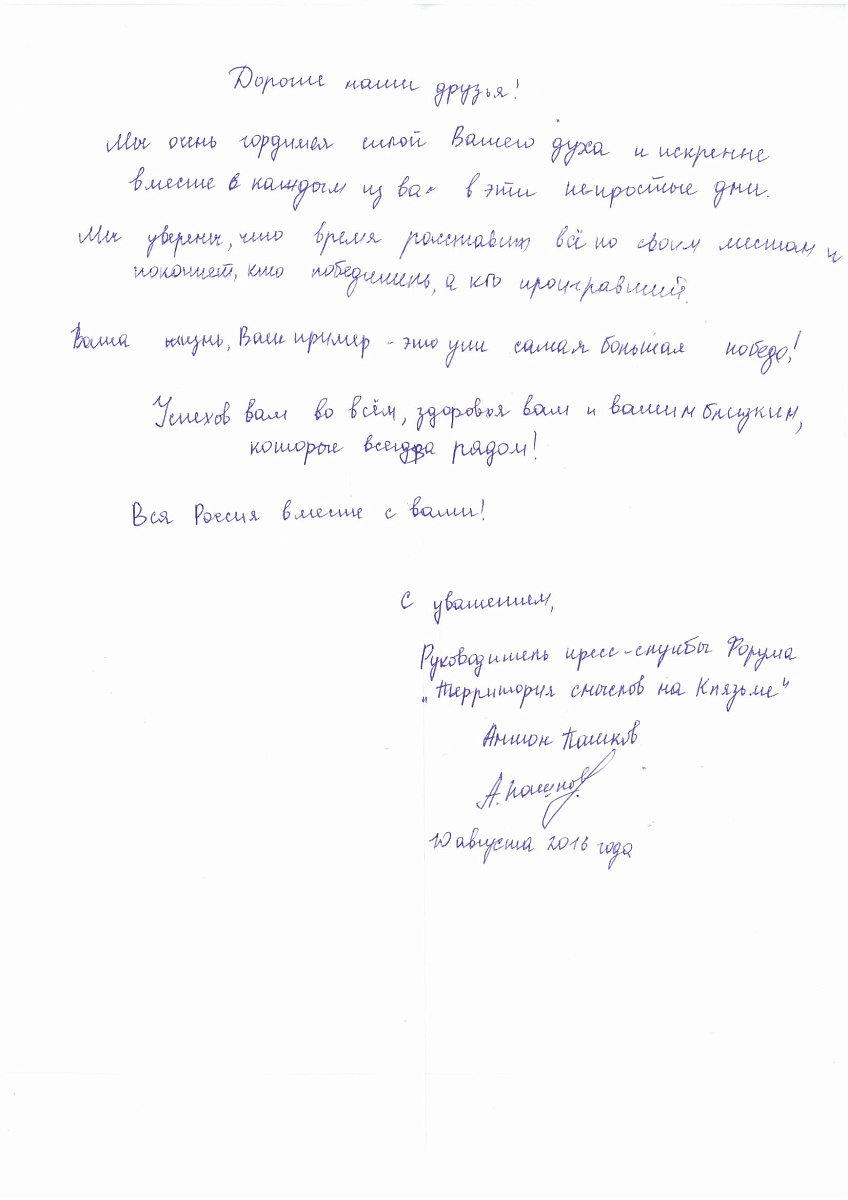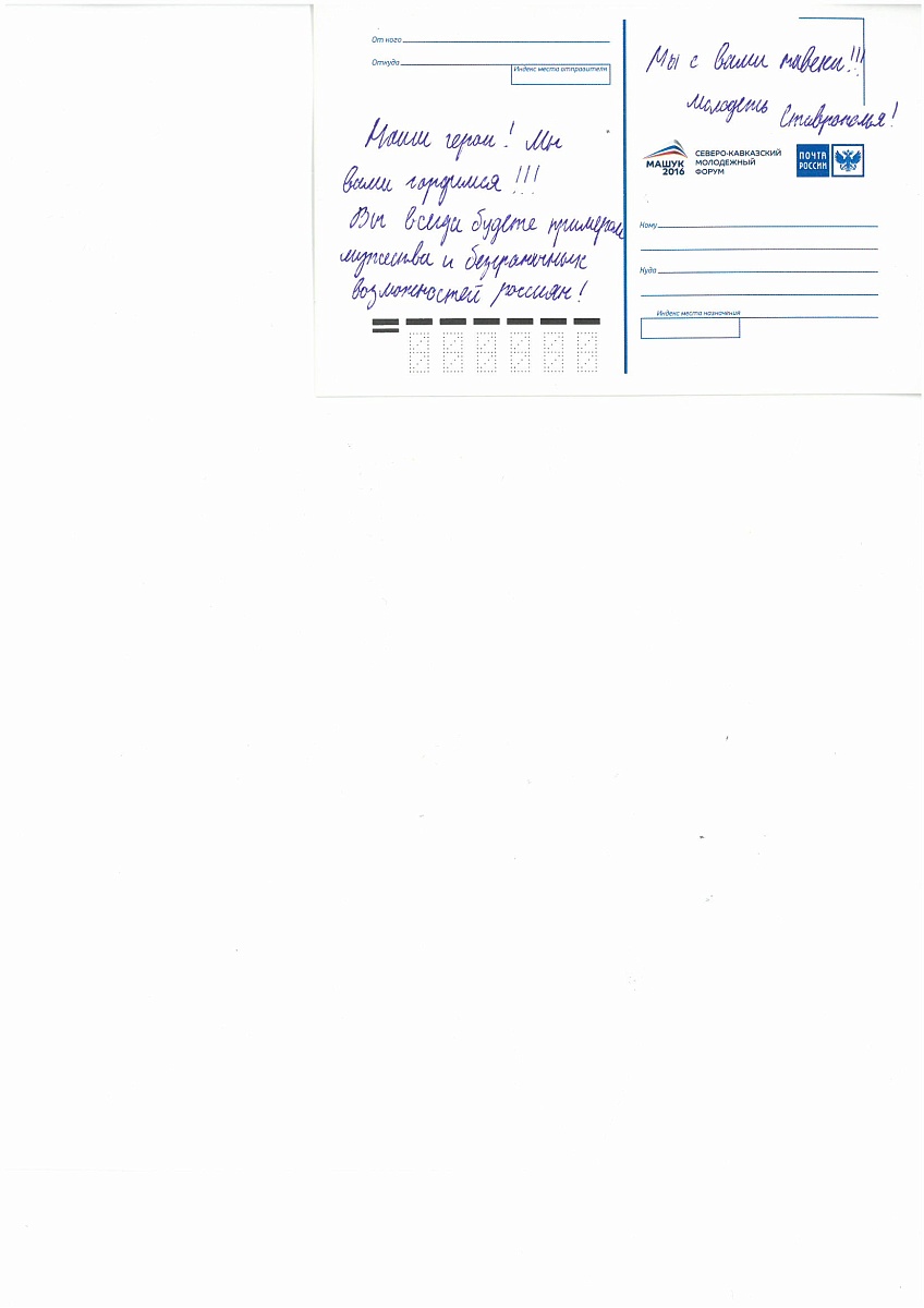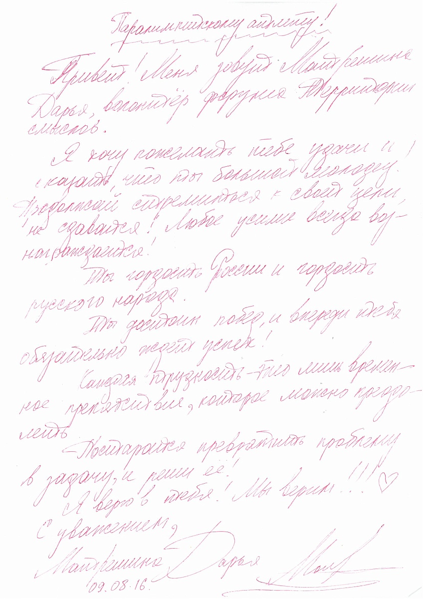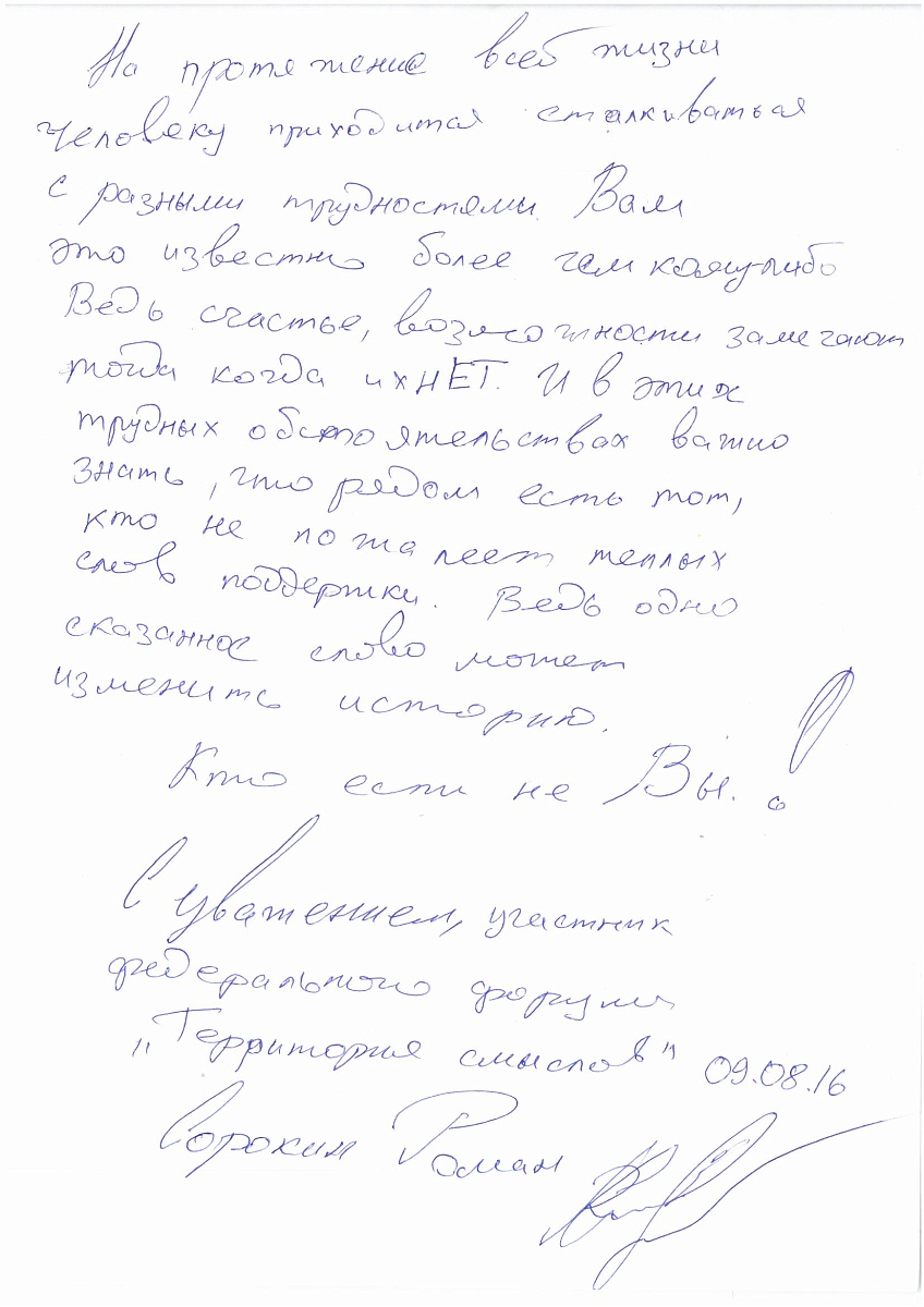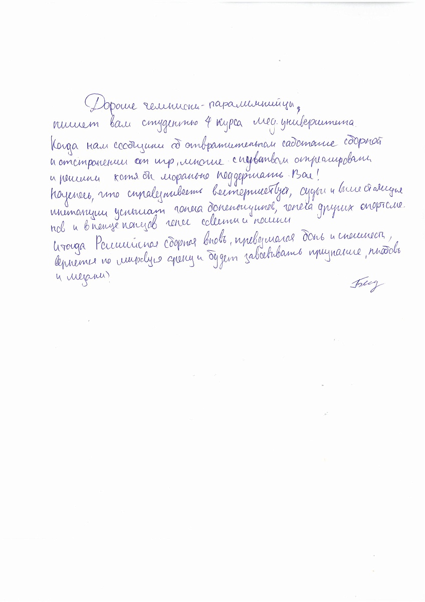 Паралимпийский комитет России получил письма в поддержку паралимпийской сборной команды России от участников Всероссийского молодежного образовательного форума «Территория смыслов» на Клязьме 9 августа участники федеральных молодёжных форумов по всей стране запустили масштабную кампанию в поддержку паралимпийской сборной России, которую в полном составе отстранили от участия в XV Летних Паралимпийских Игр в Рио-де-Жанейро. С инициативой написать письмо в Международный паралимпийский комитет выступил участник Всероссийского молодёжного образовательного форума «Территория смыслов». «Мы искренне восхищаемся силой духа и тела российских атлетов. Мы хотим напомнить им о том, как сильно мы гордимся ими и как сильно мы их уважаем. Мы хотим обратить ваше внимание на уровень поддержки. И мы просим вас не запрещать им участвовать в соревнованиях. Эти благородные атлеты тренировались в течение всей жизни, чтобы быть там и показать, что они способны творить невозможное», – говорится в тексте письма.
