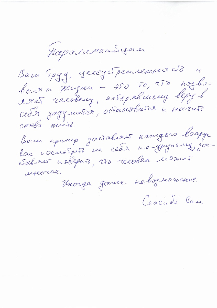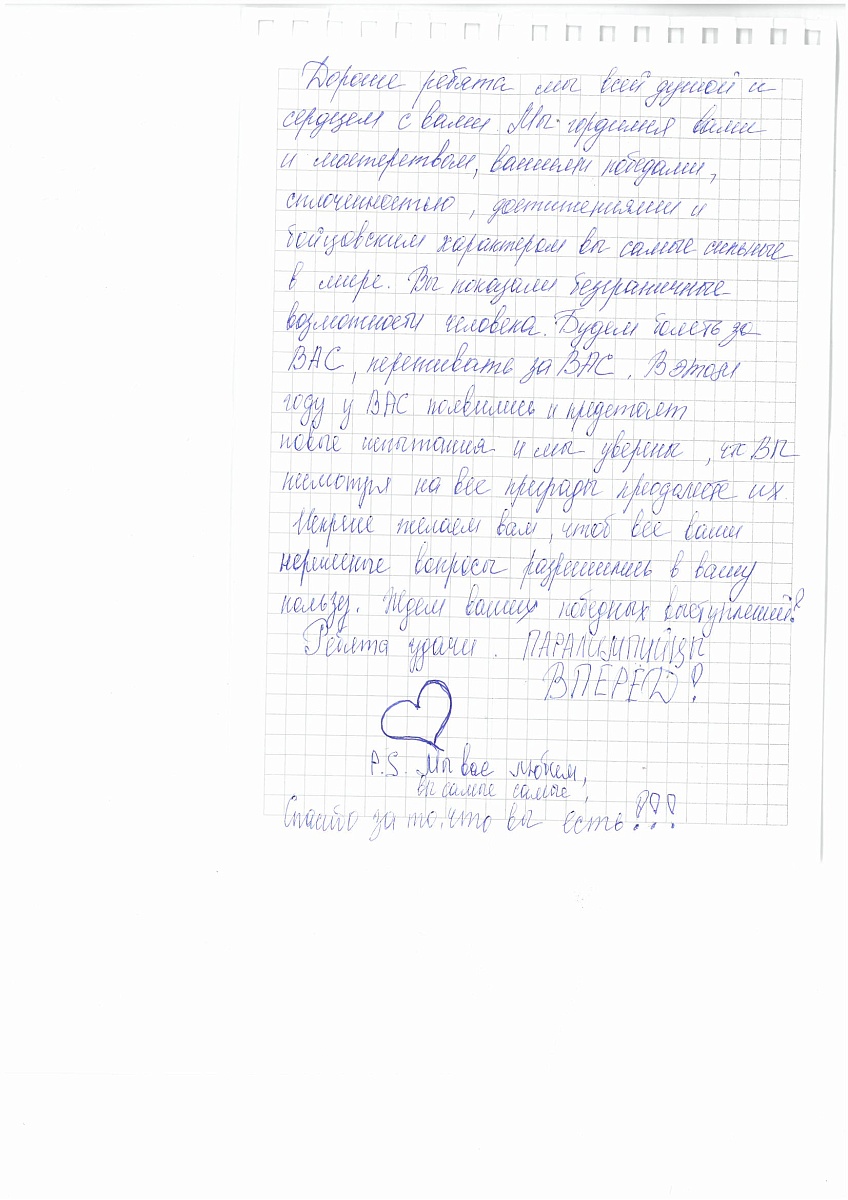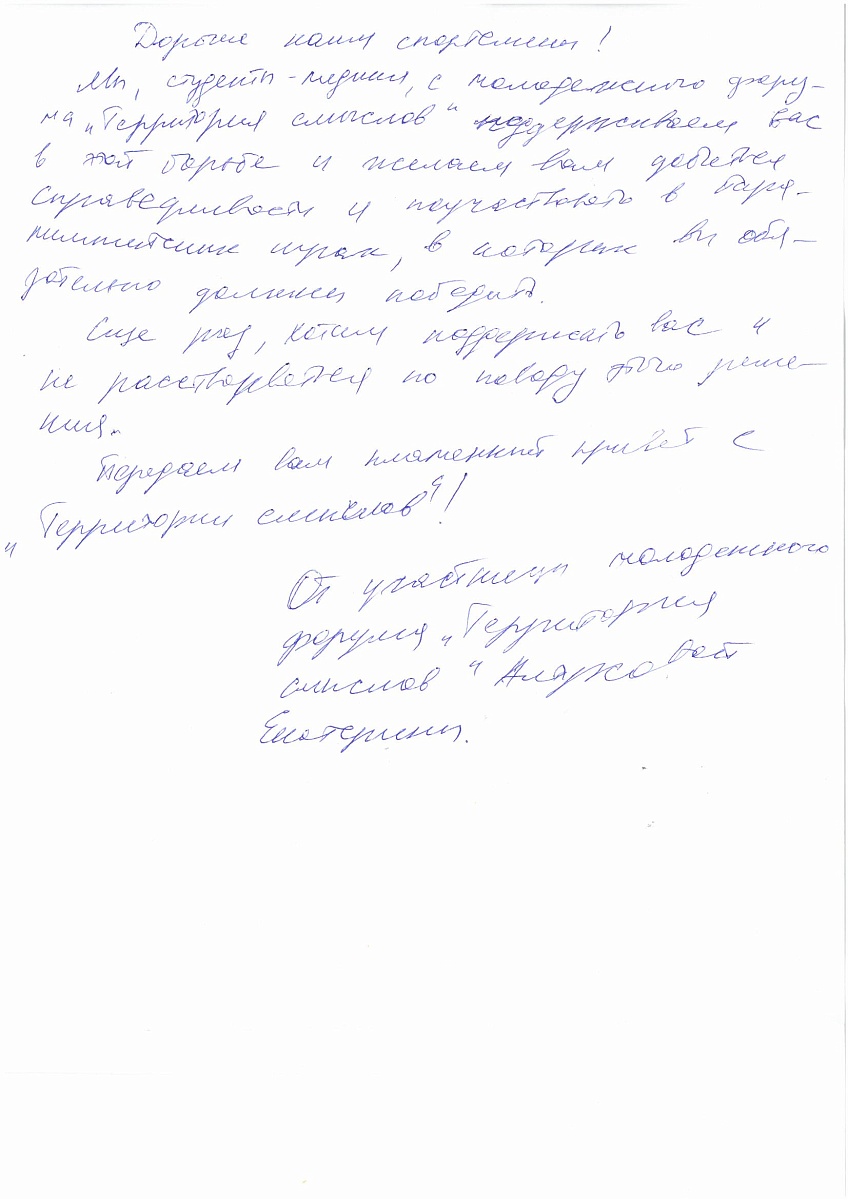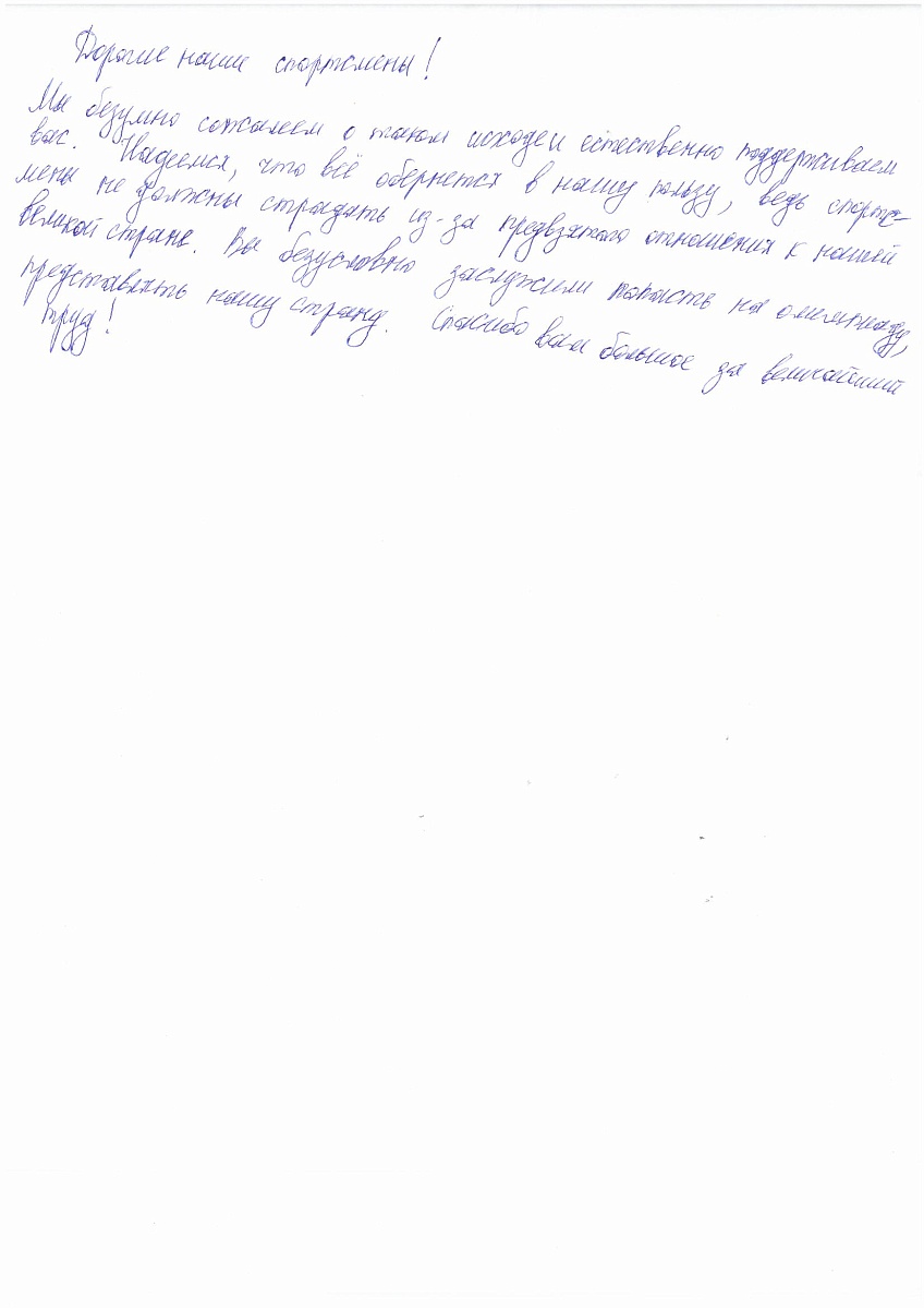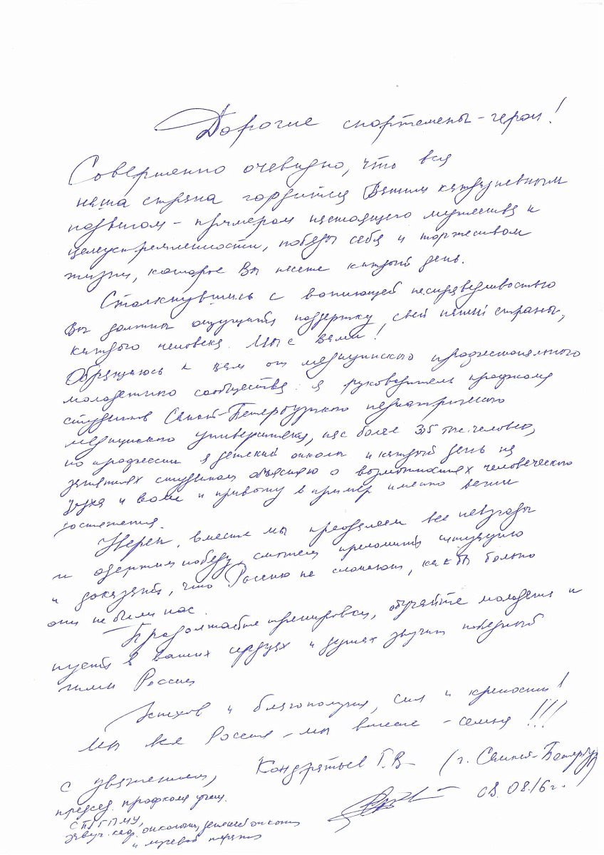 Паралимпийский комитет России получил письма в поддержку паралимпийской сборной команды России от участников Всероссийского молодежного образовательного форума «Территория смыслов» на Клязьме 9 августа участники федеральных молодёжных форумов по всей стране запустили масштабную кампанию в поддержку паралимпийской сборной России, которую в полном составе отстранили от участия в XV Летних Паралимпийских Игр в Рио-де-Жанейро. С инициативой написать письмо в Международный паралимпийский комитет выступил участник Всероссийского молодёжного образовательного форума «Территория смыслов». «Мы искренне восхищаемся силой духа и тела российских атлетов. Мы хотим напомнить им о том, как сильно мы гордимся ими и как сильно мы их уважаем. Мы хотим обратить ваше внимание на уровень поддержки. И мы просим вас не запрещать им участвовать в соревнованиях. Эти благородные атлеты тренировались в течение всей жизни, чтобы быть там и показать, что они способны творить невозможное», – говорится в тексте письма.
