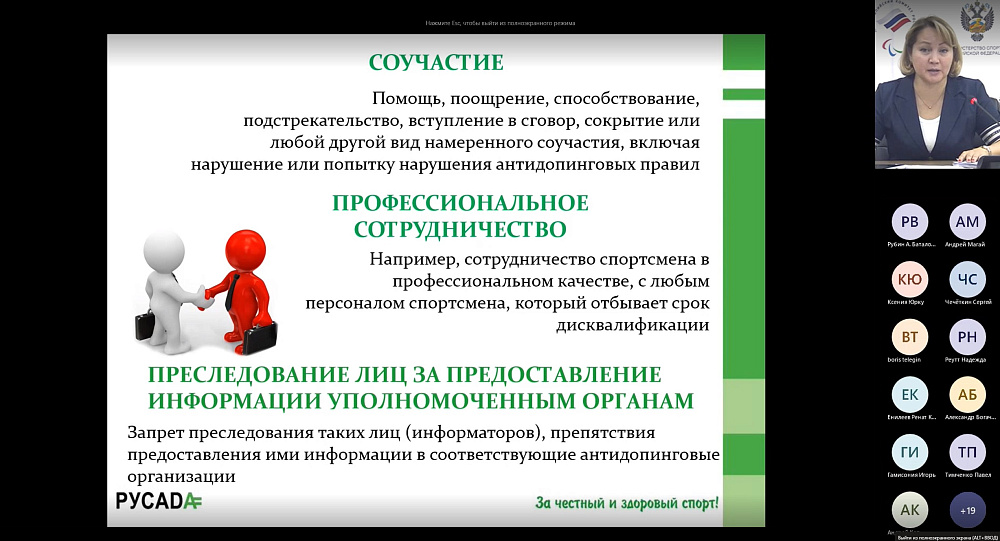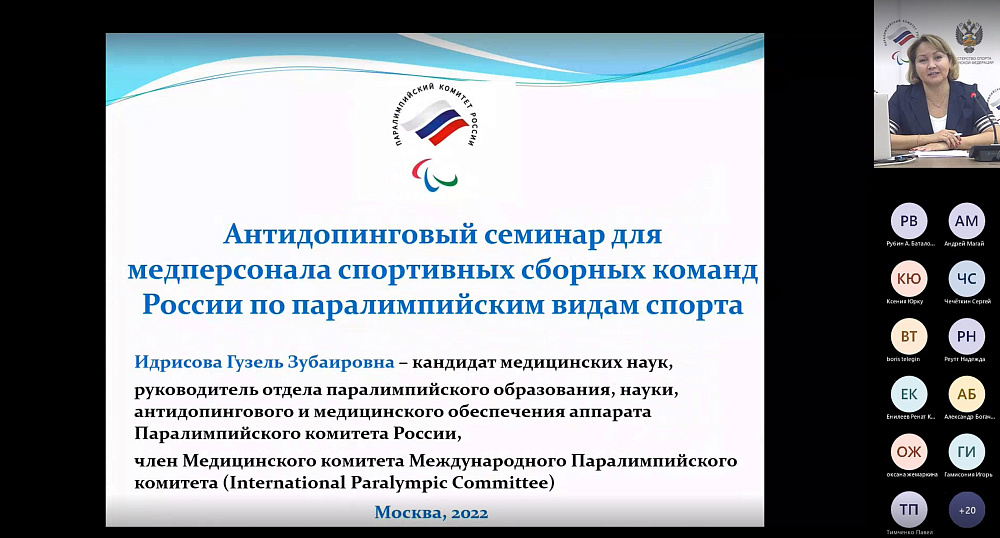 2 ноября 2022 года Паралимпийский комитет России провел Антидопинговый семинар для медицинского персонала (врачей, массажистов, психологов) спортивных сборных команд России по паралимпийским видам спорта в режиме видео-конференц-связи.