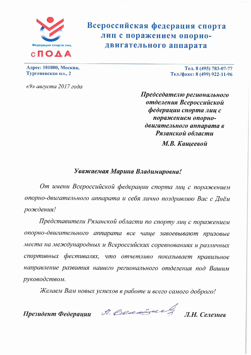 Поздравление Президента Всероссийской федерации спорта лиц с поражением опорно-двигательного аппарат Льва Селезнева председателю регионального отделения Всероссийской федерации спорта лиц с ПОДА в Рязанской области Марине Кащеевой в связи с днем рождения