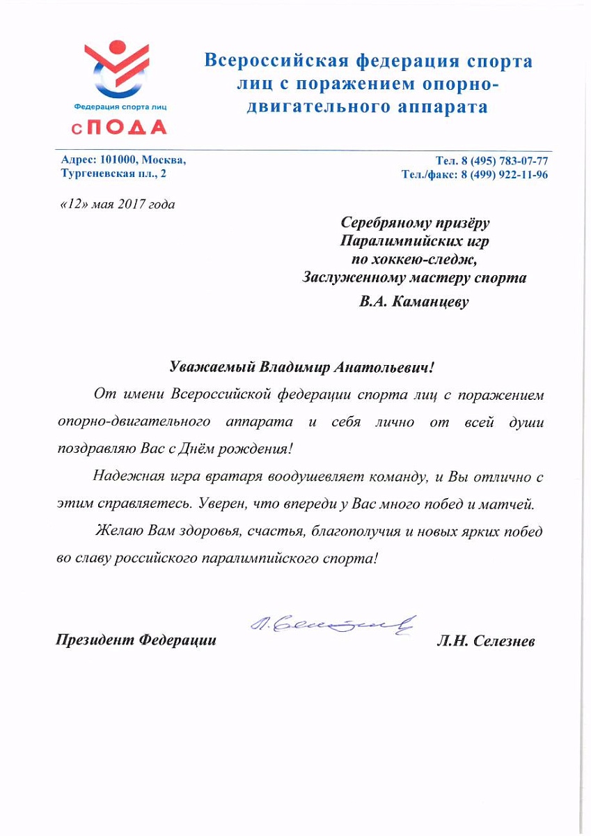 Поздравление Президента Всероссийской федерации спорта лиц с поражением опорно-двигательного аппарат Льва Селезнева серебряному призеру Паралимпийских игр по следж-хоккею, Заслуженному мастеру спорта Владимиру Каманцеву в связи с днем рождения