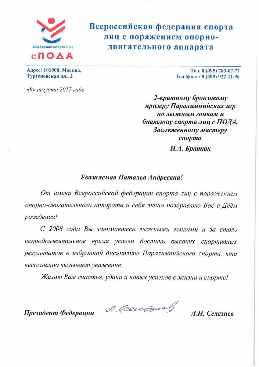Поздравление Президента Всероссийской федерации спорта лиц с поражением опорно-двигательного аппарата Льва Селезнева 2-кратному бронзовому призеру Паралимпийских игр по лыжным гонкам и биатлону спорта лиц с поражением опорно-двигательного аппарата, Заслуженному мастеру спорта Наталье. Братюк в связи с днем рождения