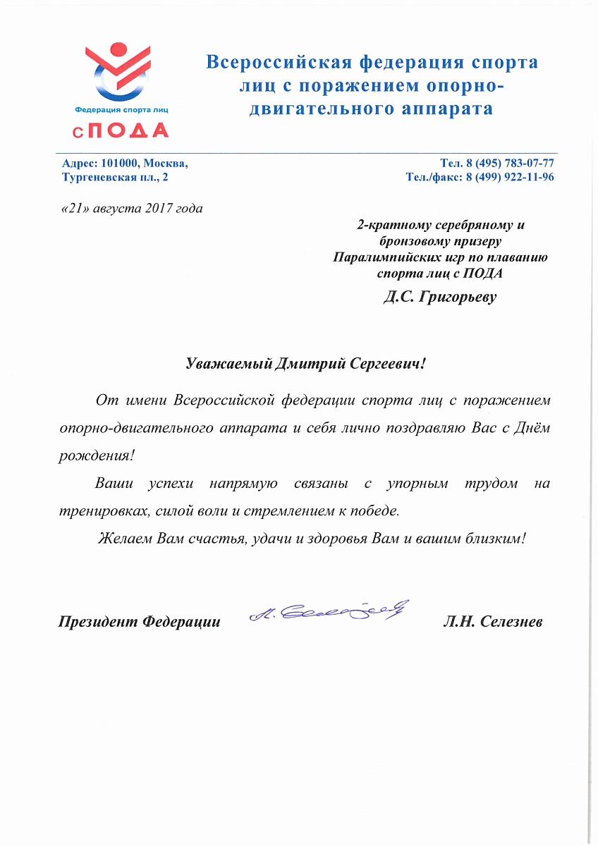Поздравление Президента Федерации Л.Н. Селезнева 2-кратному серебряному и бронзовому призеру Паралимпийских игр по плаванию спорта лиц с ПОДА, Заслуженному мастеру спорта Д. С. Григорьеву в связи с днем рождения