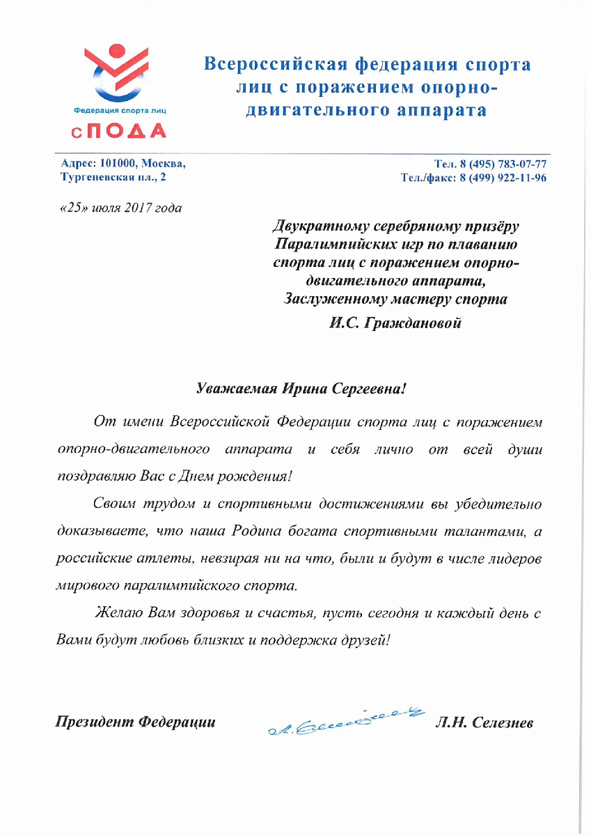 Поздравление Президента Федерации Л.Н. Селезнева 2-кратному серебряному призёру Паралимпийских игр по плаванию спорта лиц с ПОДА,Заслуженному мастеру спорта И.С. Граждановой в связи с днем рождения
