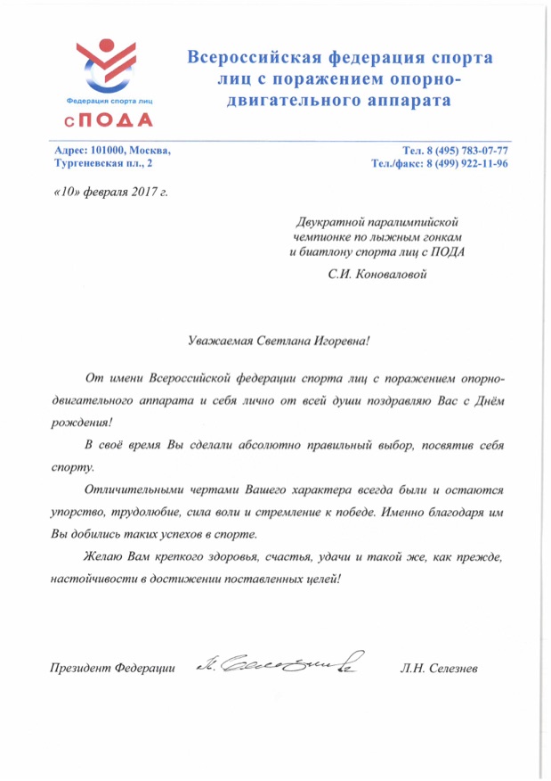 Поздравление Президента Федерации Л.Н. Селезнева 2-кратной чемпионке Паралимпийских игр по лыжным гонкам и биатлону спорта лиц с ПОДА С.И. Коноваловой в связи с днем рождения