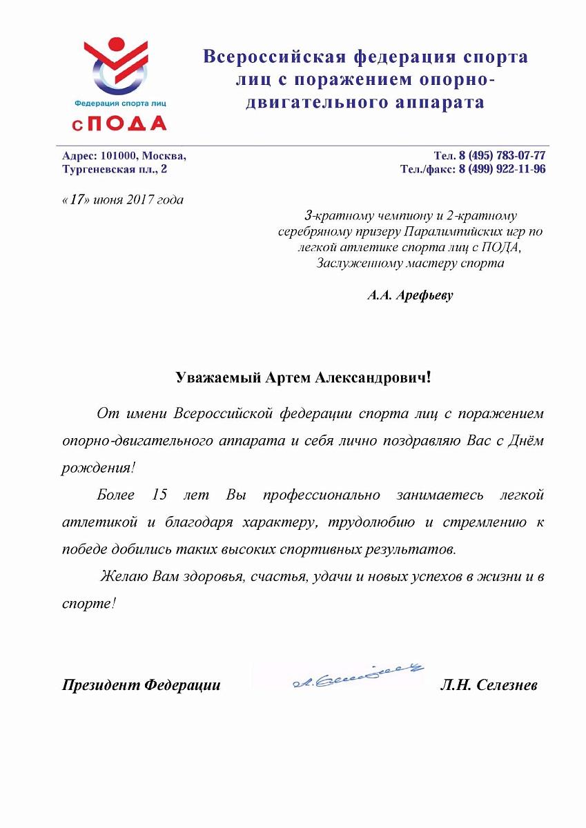 Поздравление Президента Федерации Л.Н. Селезнева 3-кратному чемпиону и 2-кратному серебряному призеру Паралимпийских игр по легкой атлетике спорта лиц с ПОДА, Заслуженному мастеру спорта А.А. Арефьеву в связи с днем рождения