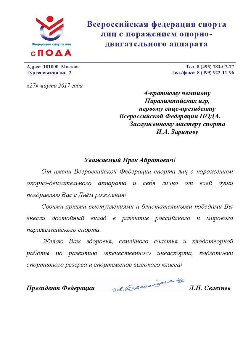 Поздравление Президента Федерации Л.Н. Селезнева 4-кратному чемпиону Паралимпийских игр, первому вице-президенту Всероссийской Федерации ПОДА, Заслуженному мастеру спорта И.А. Зарипову в связи с днем рождения