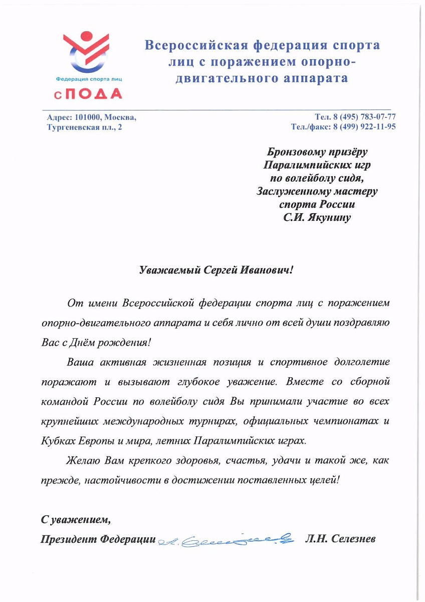 Поздравление Президента Всероссийской федерации спорта лиц с поражением опорно-двигательного аппарата Льва Селезнева бронзовому призеру Паралимпийских игр по волейболу сидя, Заслуженному мастеру спорта России Сергею Якунину в связи с днем рождения