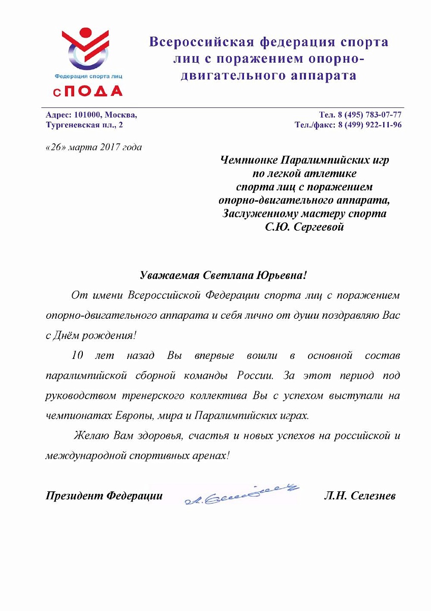 Поздравление Президента Федерации Л.Н. Селезнева чемпионке Паралимпийских игр по легкой атлетике, Заслуженному мастеру спорта С.Ю. Сегреевой в связи с днем рождения