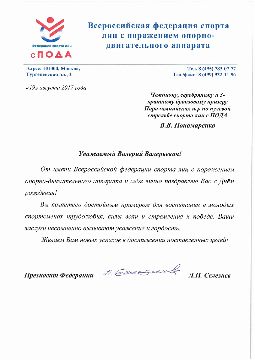 Поздравление Президента Всероссийской федерации спорта лиц с поражением опорно-двигательного аппарат Льва Селезнева чемпиону, серебряному и 3-кратному бронзовому призеру Паралимпийских игр по пулевой стрельбе спорта лиц с ПОДА, Заслуженному мастеру спорта Валерию Пономаренко в связи с днем рождения