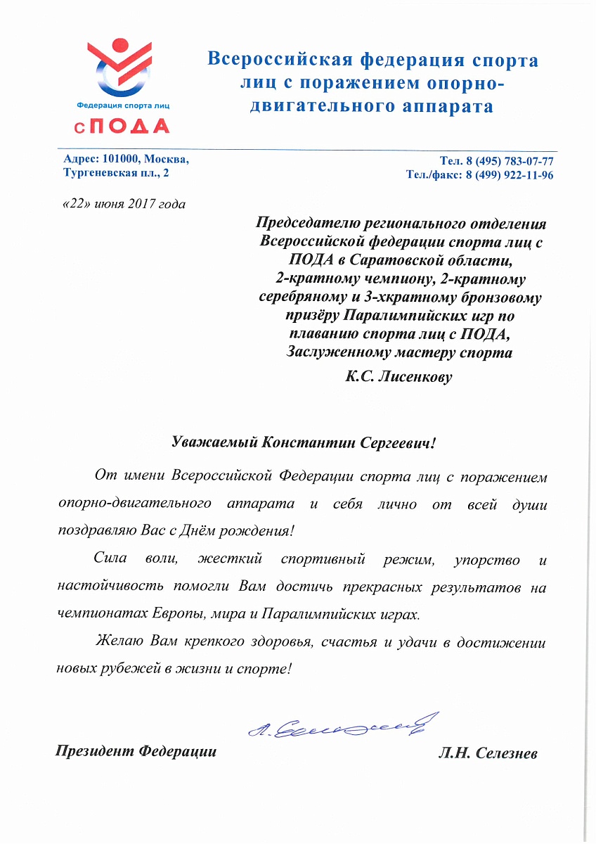 Поздравление Президента Всероссийской федерации спорта лиц с поражением опорно-двигательного аппарат Льва Селезнева Председателю регионального отделения Всероссйиской федерации спорта лиц с ПОДА в Саратовской области, 2-кратному чемпиону, 2-кратному серебряному и 3-хкратному бронзовому призёру Паралимпийских игр по плаванию спорта лиц с ПОДА, Заслуженному мастеру спорта Константину Лисенкову в связи с Днем рождения