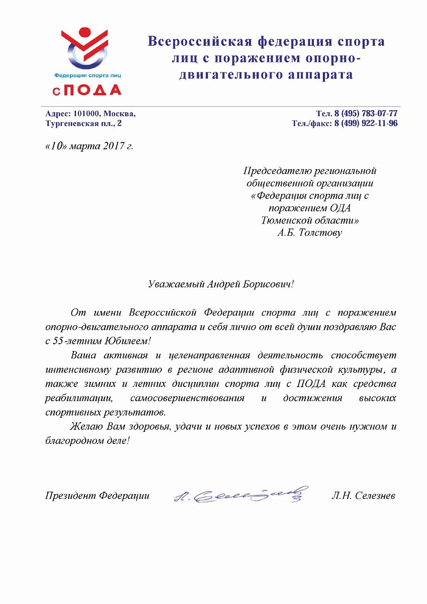 Поздравление Президента Федерации Л.Н. Селезнева председателю региональной общественной организации спорта лиц с ПОДА в Тюменской области А.Б. Толстому в связи с 55-летним юбилеем
