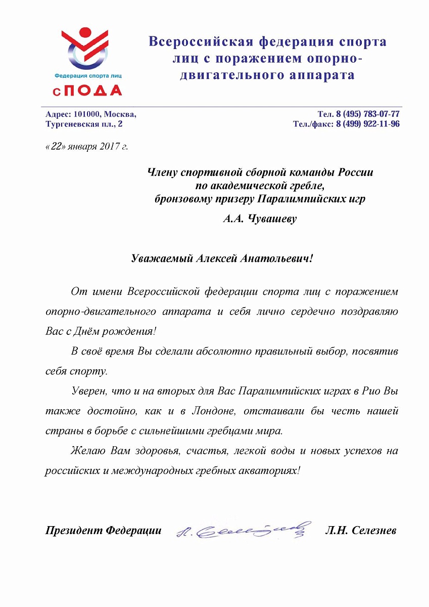 Поздравление Президента Всероссийской федерации спорта лиц с поражением опорно-двигательного аппарата Льва Селезнева серебряного призера Паралимпийских игр по академической гребле спорта лиц с ПОДА Алексея Чувашева в связи с днем рождения