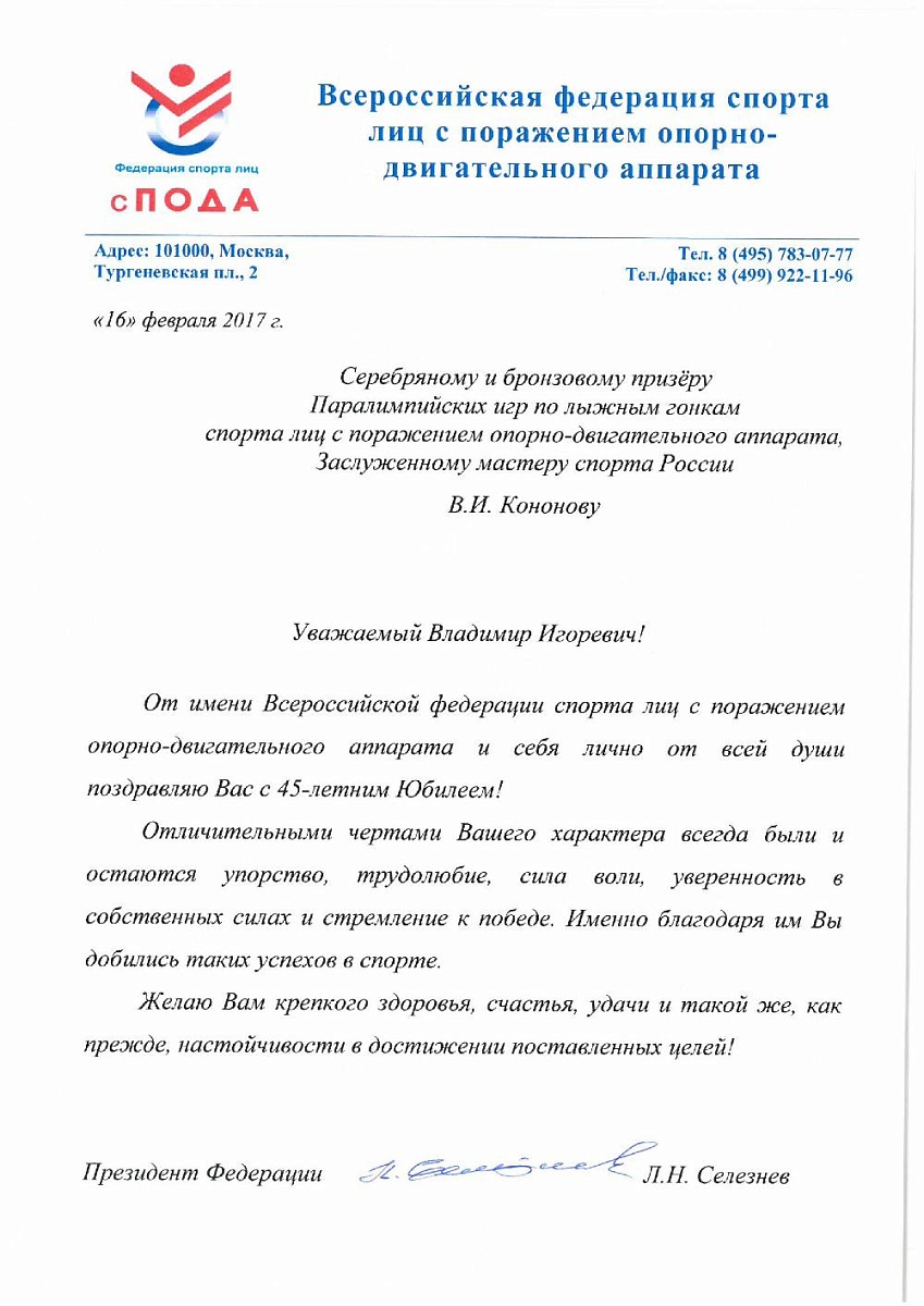 Поздравление Президента Всероссийской федерации спорта лиц с поражением опорно-двигательного аппарата Льва Селезнева серебряному и бронзовому призеру Паралимпийских игр по лыжным гонкам и биатлону спорта лиц с ПОДА, Заслуженному мастеру спорта России Владимиру Кононову в связи с 45-летним юбилеем