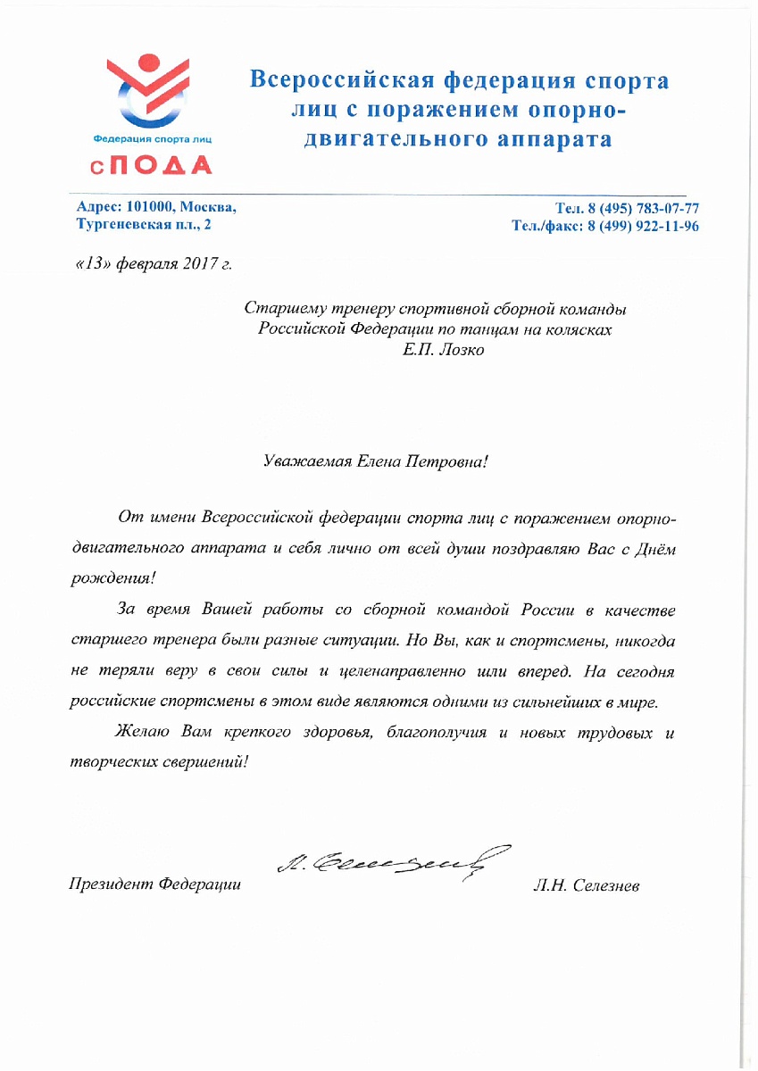 Поздравление Президента Федерации Л.Н. Селезнева старшему тренеру сборной команды России по танцам на колясках Е.П. Лозко в связи с днем рождения
