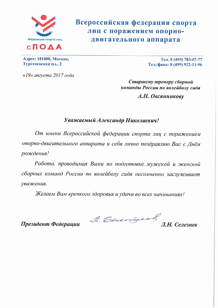 Поздравление Президента Федерации Л.Н. Селезнева старшему тренеру сборной команды России по волейболу сидя А.Н. Овсянникову в связи с днем рождения