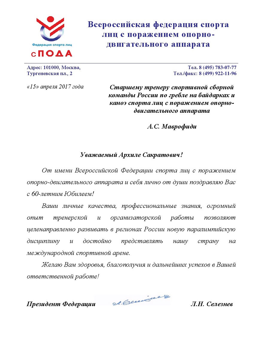 Поздравление Президента Федерации Л.Н. Селезнева старшему тренеру спортивной сборной команды России по гребле на байдарках и каноэ спорта лиц с ПОДА А.С. Маврофиди в связи с 60-летним Юбилеем