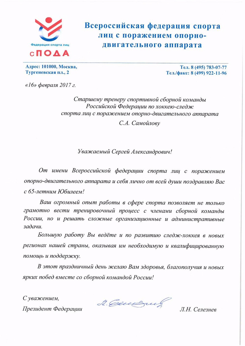 Поздравление Президента Федерации Л.Н.Селезнева старшему тренеру спортивной сборной команды России по следж-хоккею, Заслуженному тренеру России С.А. Самойлову в связи с 65-летним юбилеем