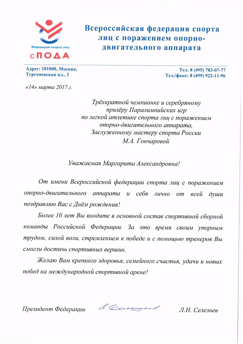 Поздравление Президента Всероссийской федерации спорта лиц с поражением опорно-двигательного аппарата Льва Селезнева Заслуженному мастеру спорта России, трехкратной чемпионке и серебряному призеру Паралимпийских игр по легкой атилетике Маргарите Гончаровой в связи с днем рождения