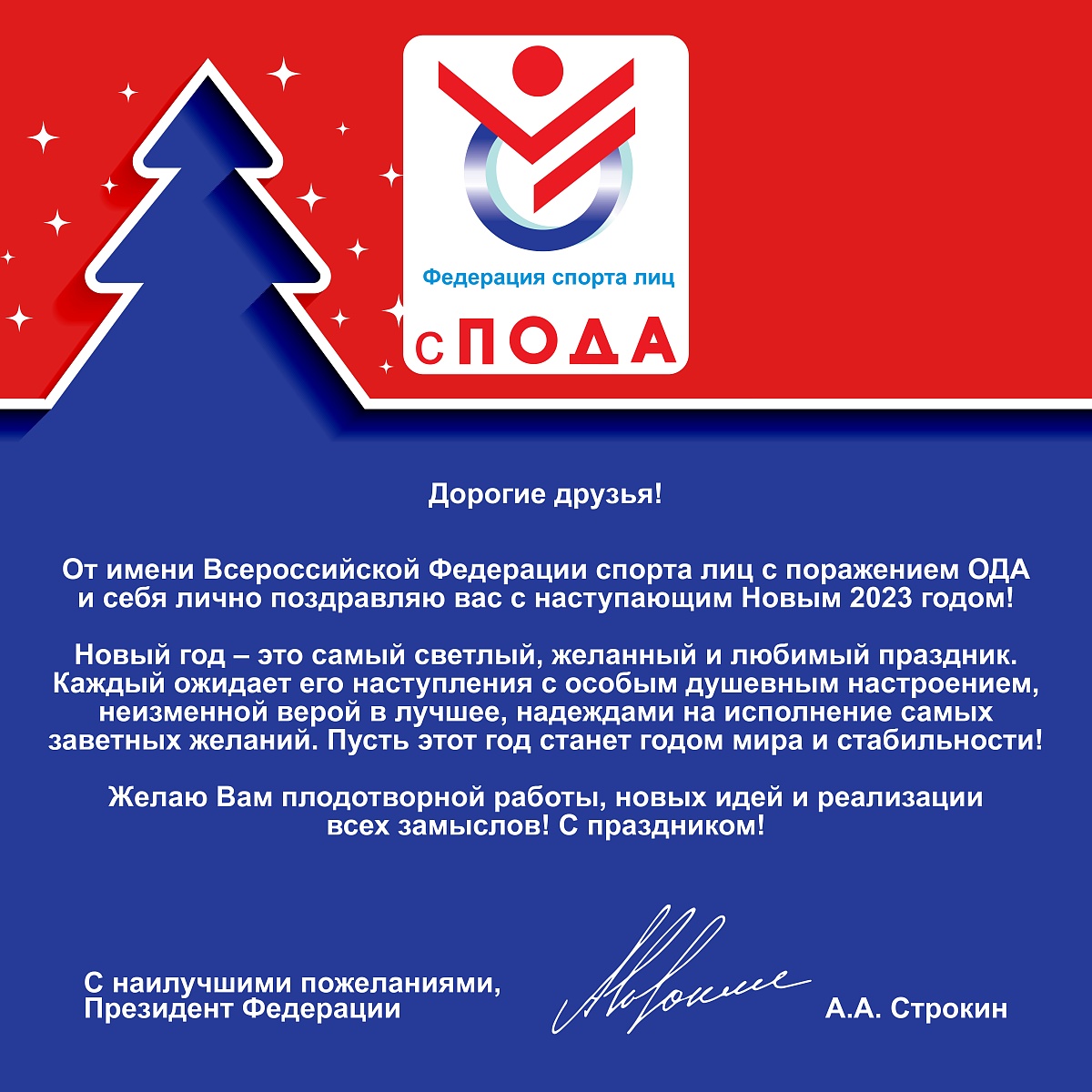 Поздравление президента Всероссийской федерации спорта лиц с поражением ОДА А.А. Строкина С Новым 2023 годом!
