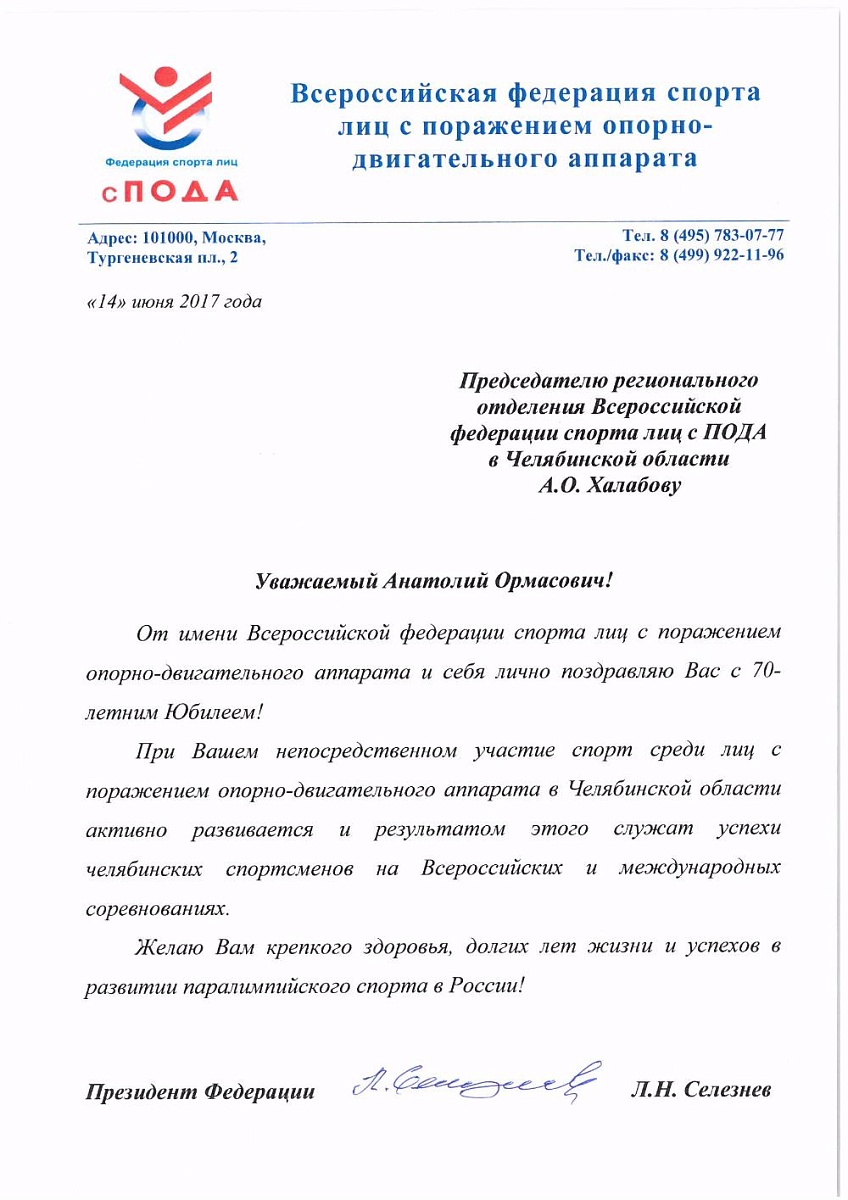 Поздравление Президента Всероссийской федерации спорта лиц с поражением опорно-двигательного аппарат Льва Селезнева председателю регионального отделения Всероссийской федерации спорта лиц с ПОДА в Челябинской области Анатолию Халабову в связи с 70-летним Юбилеем