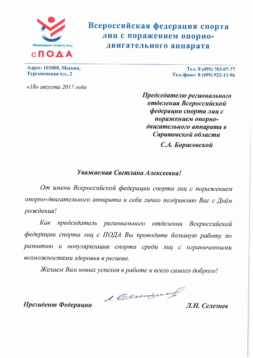 Поздравление Президента Федерации Л.Н. Селезнева председателю регионального отделения Всероссийской федерации спорта лиц с ПОДА в Саратовской области С.А. Борисовской в связи с днем рождения