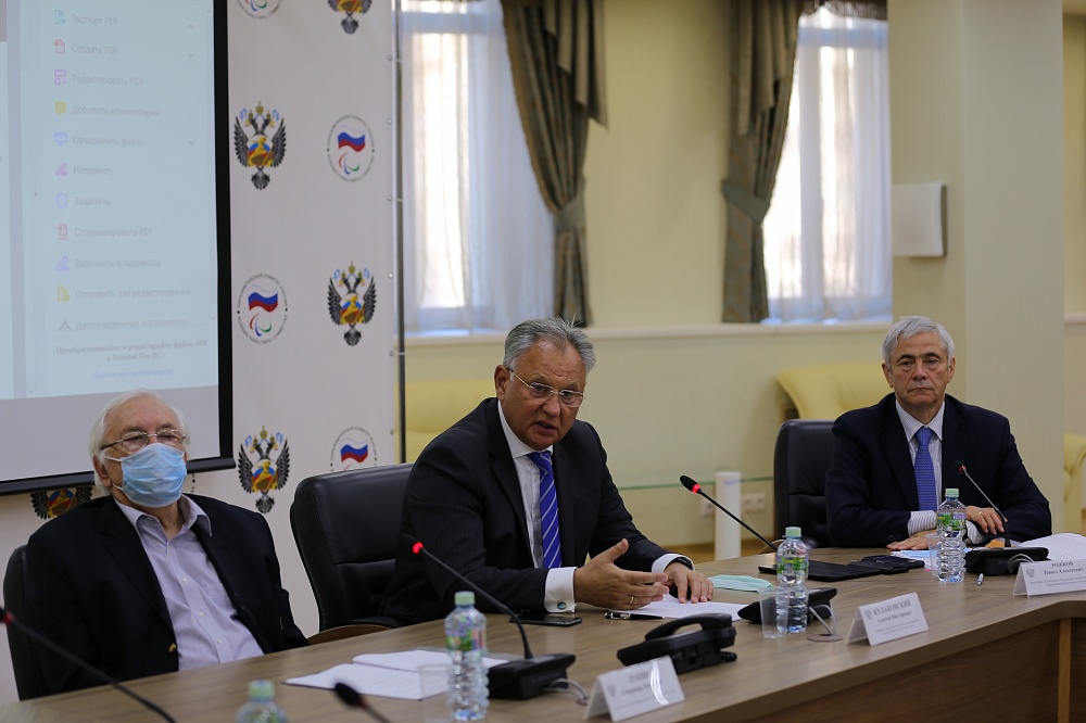 Президент Всероссийской федерации спорта лиц с поражением ОДА, 5-кратный чемпион Паралимпийских игр Андрей Строкин и первый вице-президент Всероссийской федерации спорта лиц с поражением ОДА Павел Рожков в зале Исполкома Паралимпийского комитета России приняли участие в заседание Межведомственной комиссии по развитию адаптивной физической культуры и спорта Совета при Президенте Российской Федерации по развитию физической культуры и спорта под руководством президента ПКР Владимира Лукина.