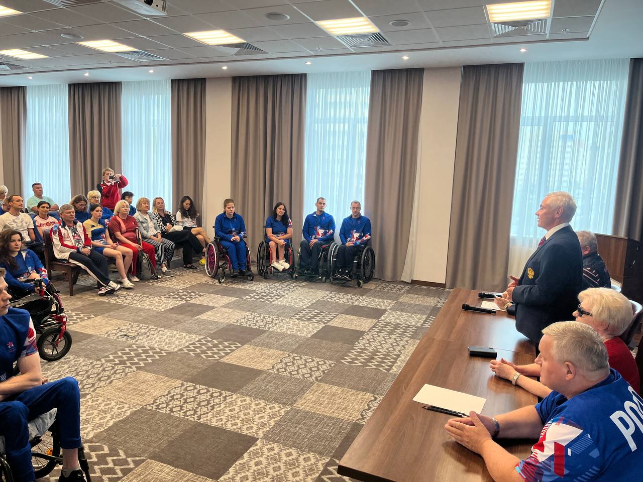 Во встрече приняли участие руководитель делегации Российской Федерации, президент Всероссийской Федерации спорта лиц с поражением ОДА, 5-кратный чемпион Паралимпийских игр Андрей Строкин, главный тренер паралимпийской сборной команды России по плаванию, старший тренер сборной команды России по плаванию спорта лиц с ПОДА Юрий Назаренко, старший тренер сборной команды России по плаванию спорта слепых Игорь Тверяков, спортсмены, тренеры и специалисты сборных команд России по плаванию спорта лиц с ПОДА и спорта слепых.