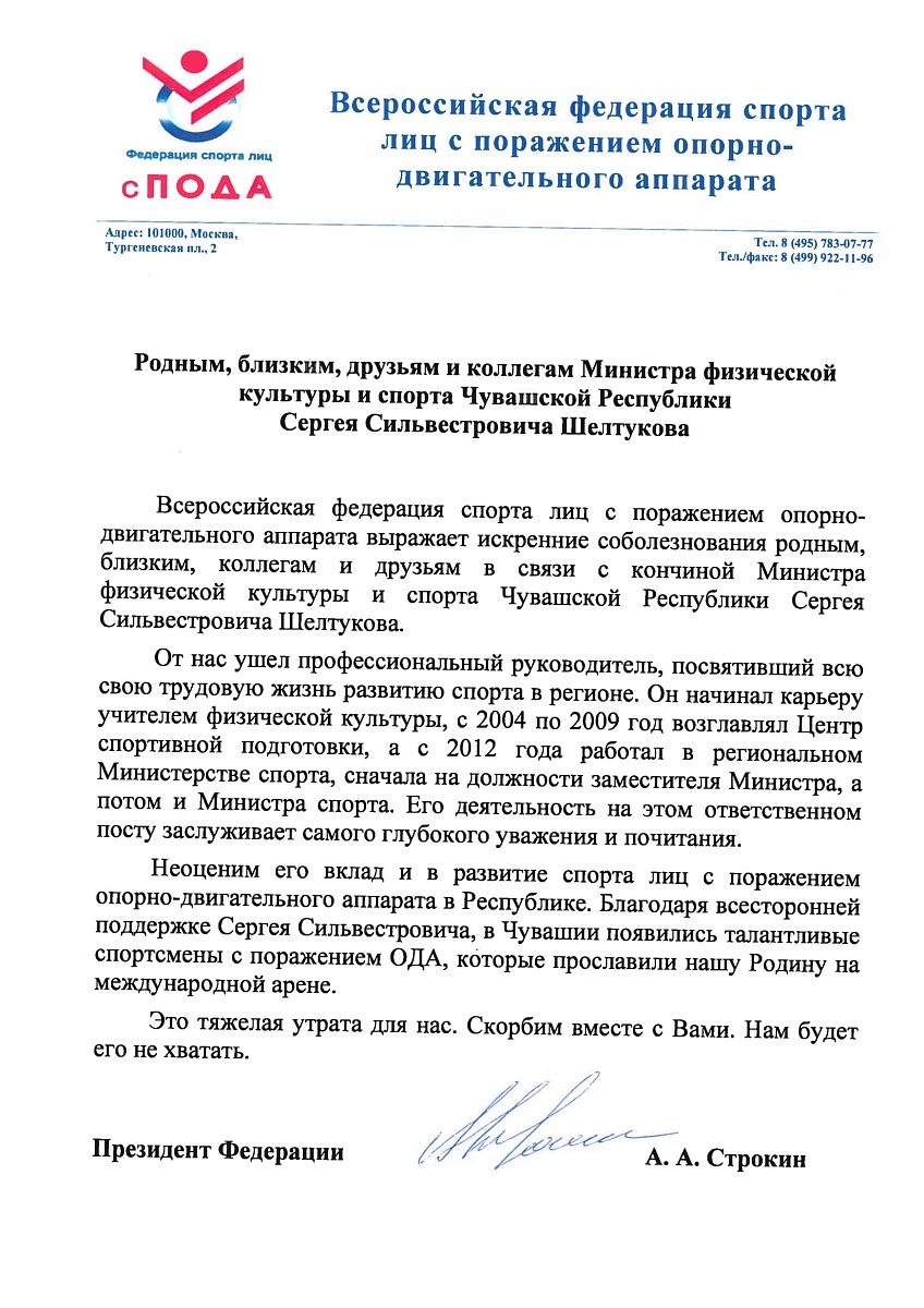 Всероссийская федерация спорта лиц с ПОДА выражает соболезнования родным, близким, друзьям и коллегам Министра физической культуры и спорта Чувашской Республики С.С. Шелтукова